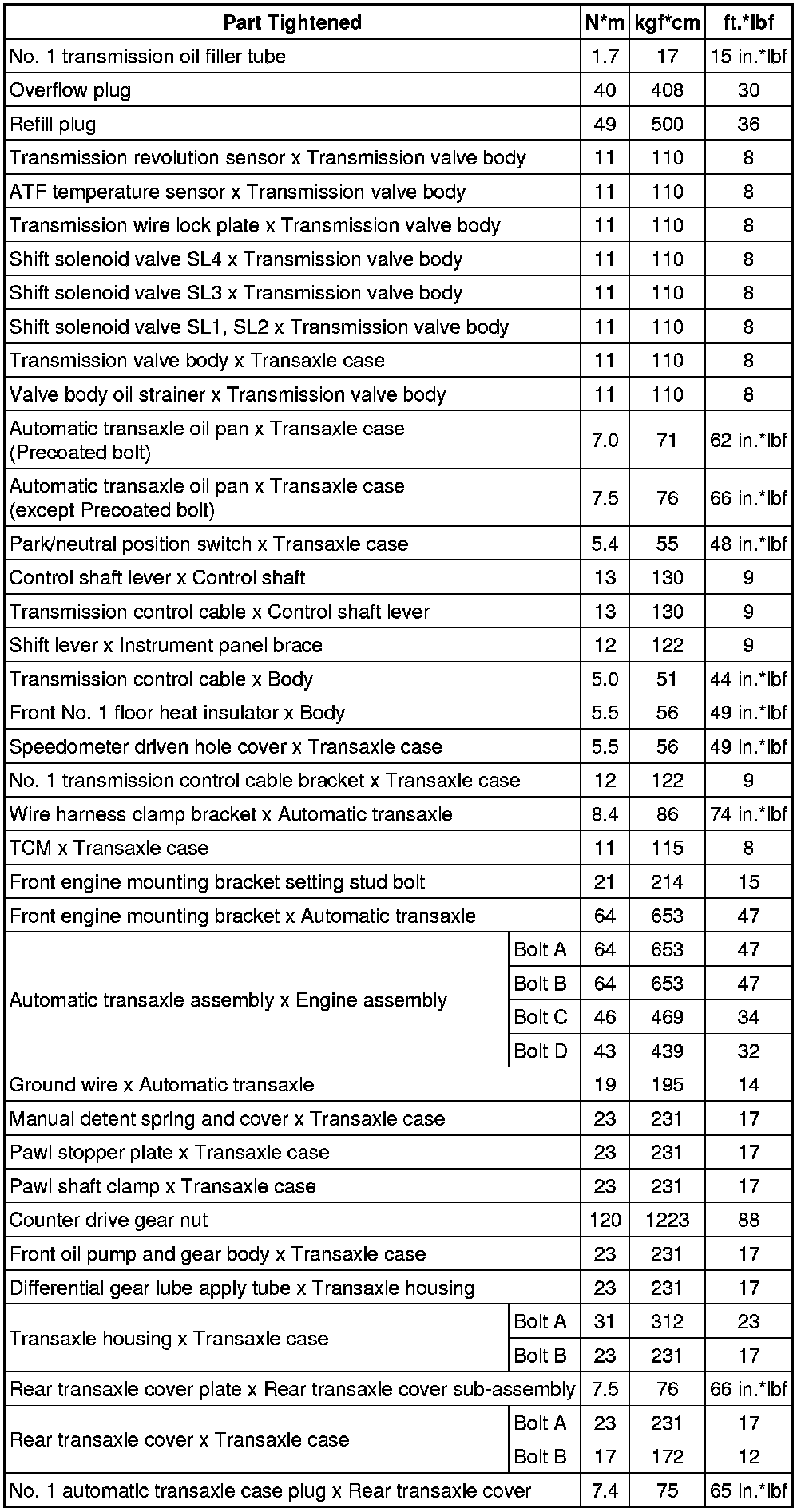 SPECIFICATIONS: U660F AUTOMATIC TRANSMISSION / TRANSAXLE: TORQUE SPECIFICATIONS