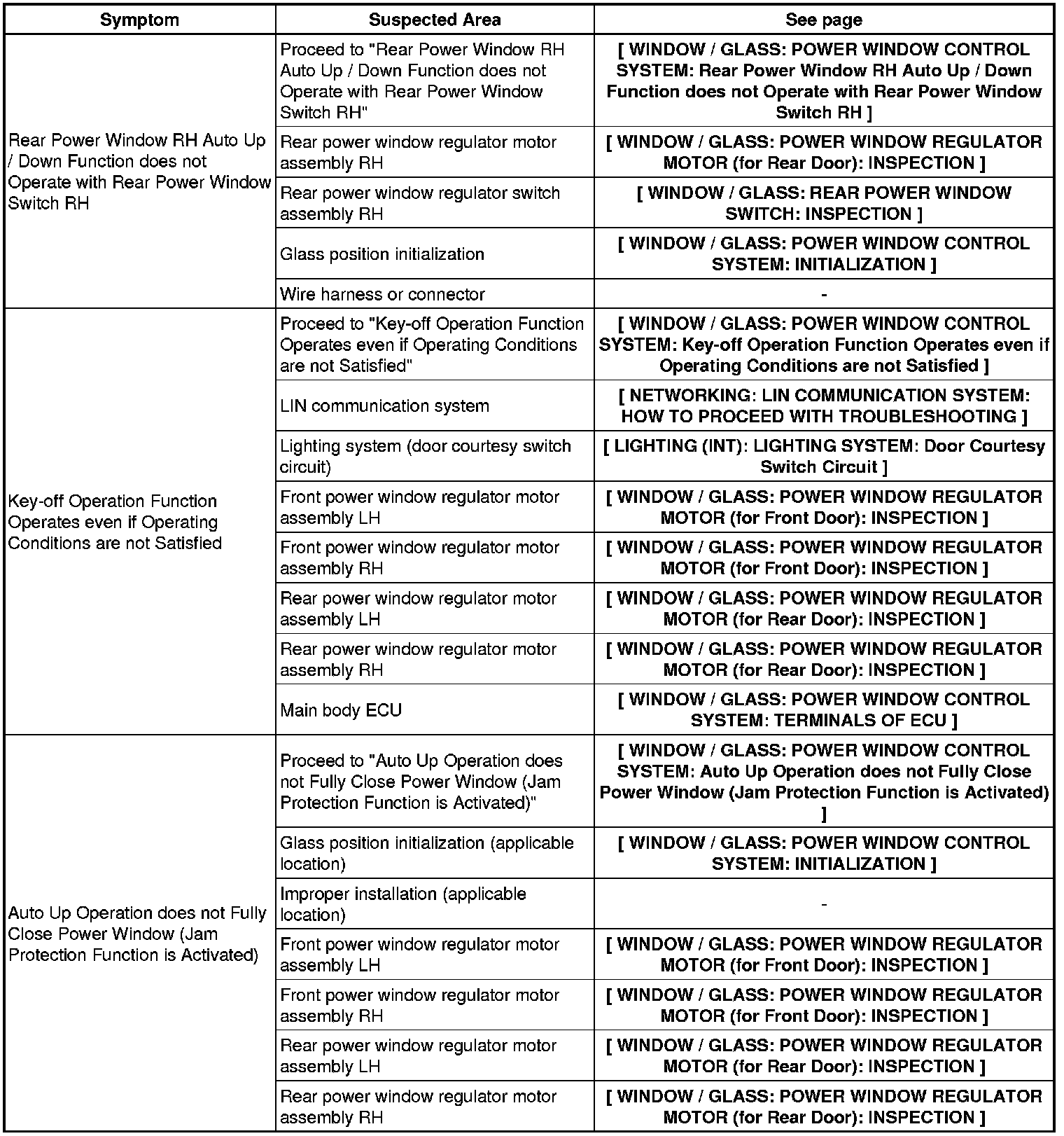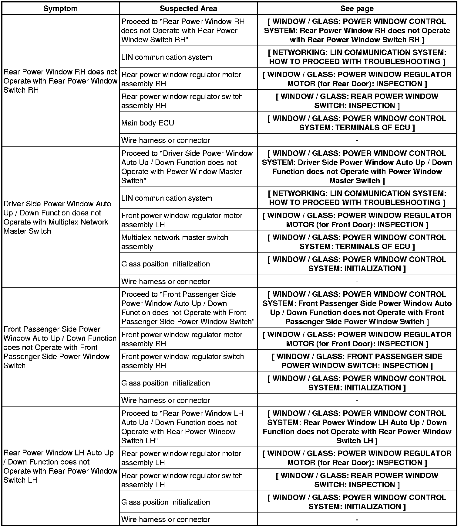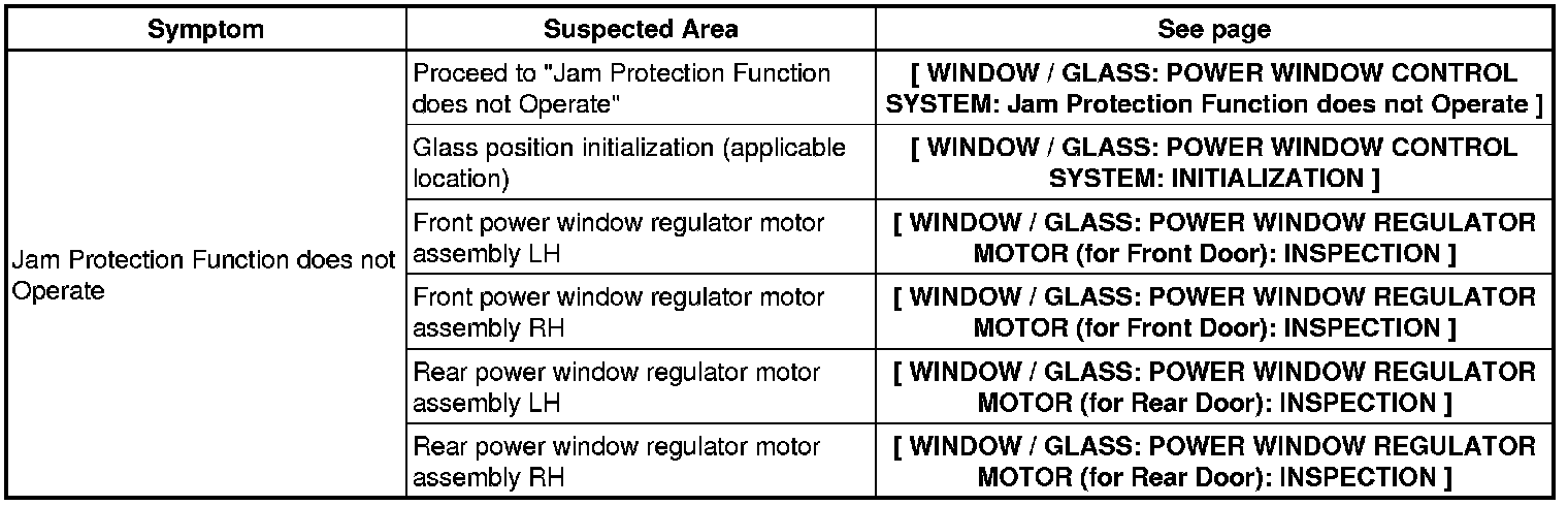 WINDOW / GLASS: POWER WINDOW CONTROL SYSTEM: PROBLEM SYMPTOMS TABLE