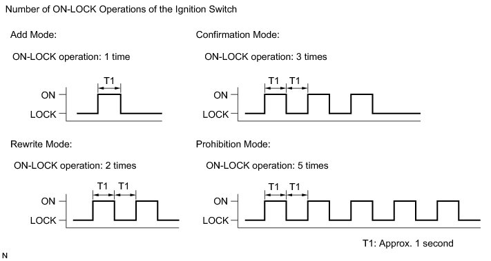 (4) Turn the ignition switch from LOCK to ON and back to LOCK at approximately 1-second intervals 1 to 5 times to select a mode (see the illustration). Then remove the key from the ignition key cylinder.