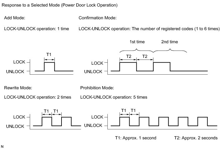 (5) After selecting a mode, the main body ECU (driver side junction block assembly) automatically performs the power door LOCK- UNLOCK operation within 5 seconds to indicate the selected mode (see the illustration).
