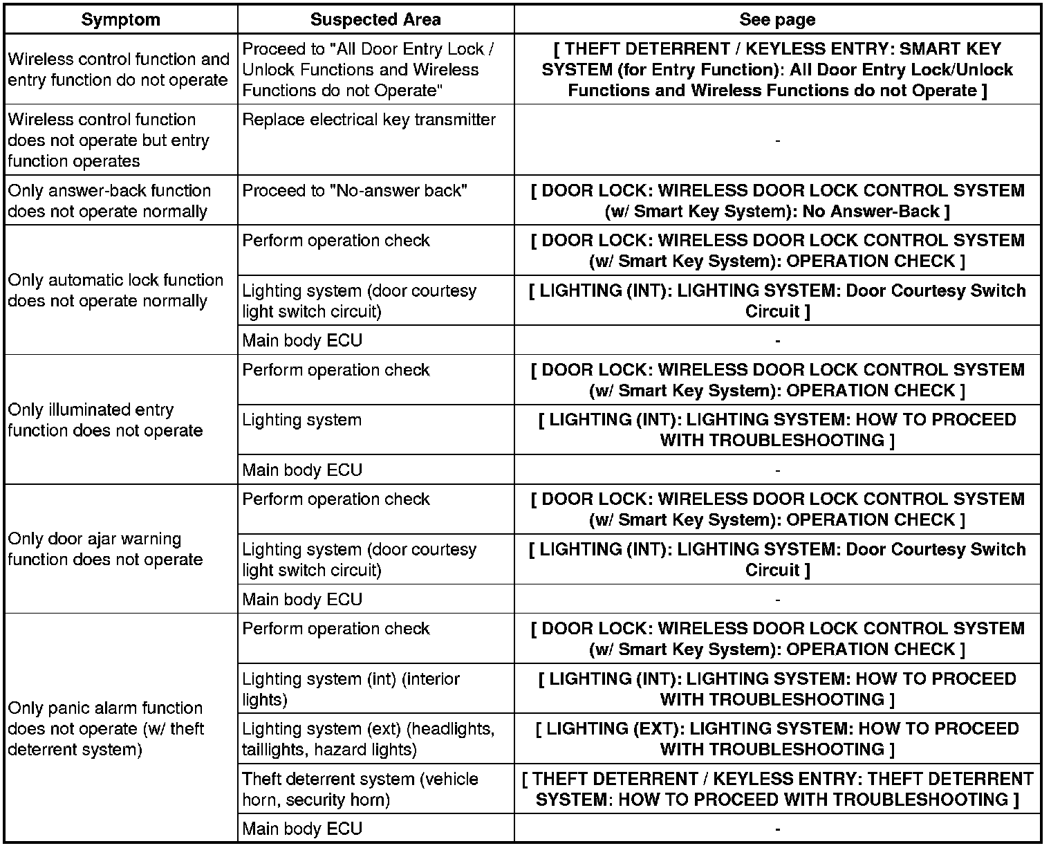 DOOR LOCK: WIRELESS DOOR LOCK CONTROL SYSTEM (w/ Smart Key System): PROBLEM SYMPTOMS TABLE