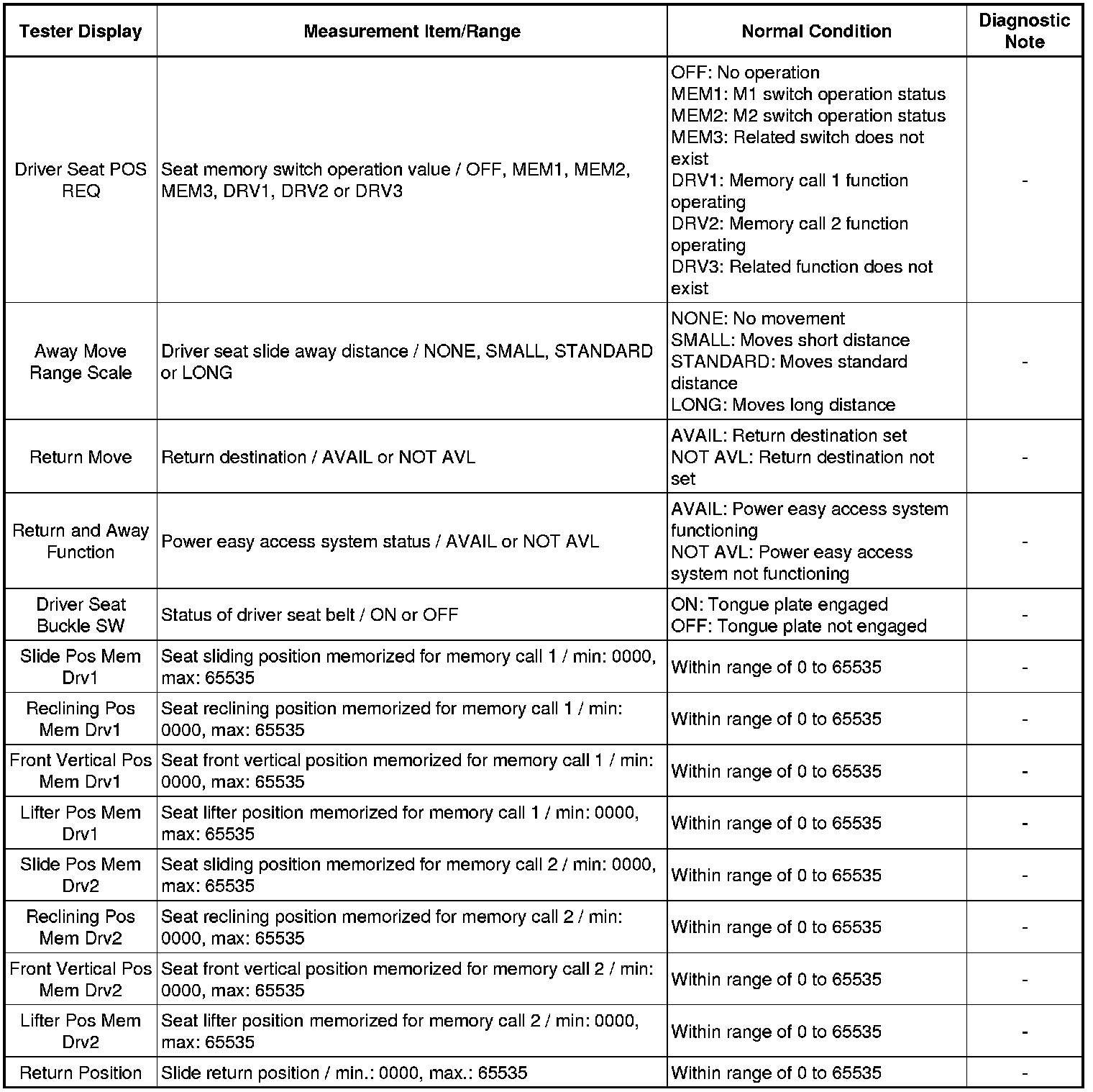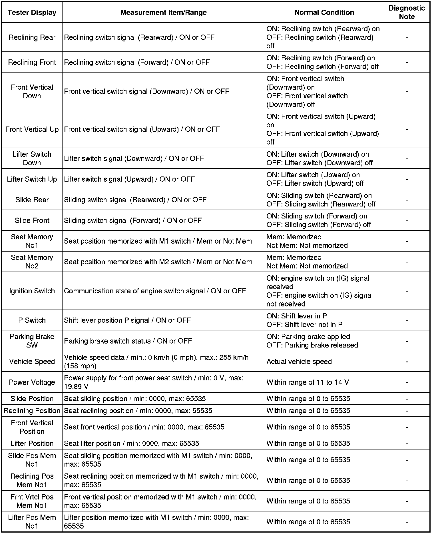 SEAT: FRONT POWER SEAT CONTROL SYSTEM (w/ Memory): DATA LIST / ACTIVE TEST