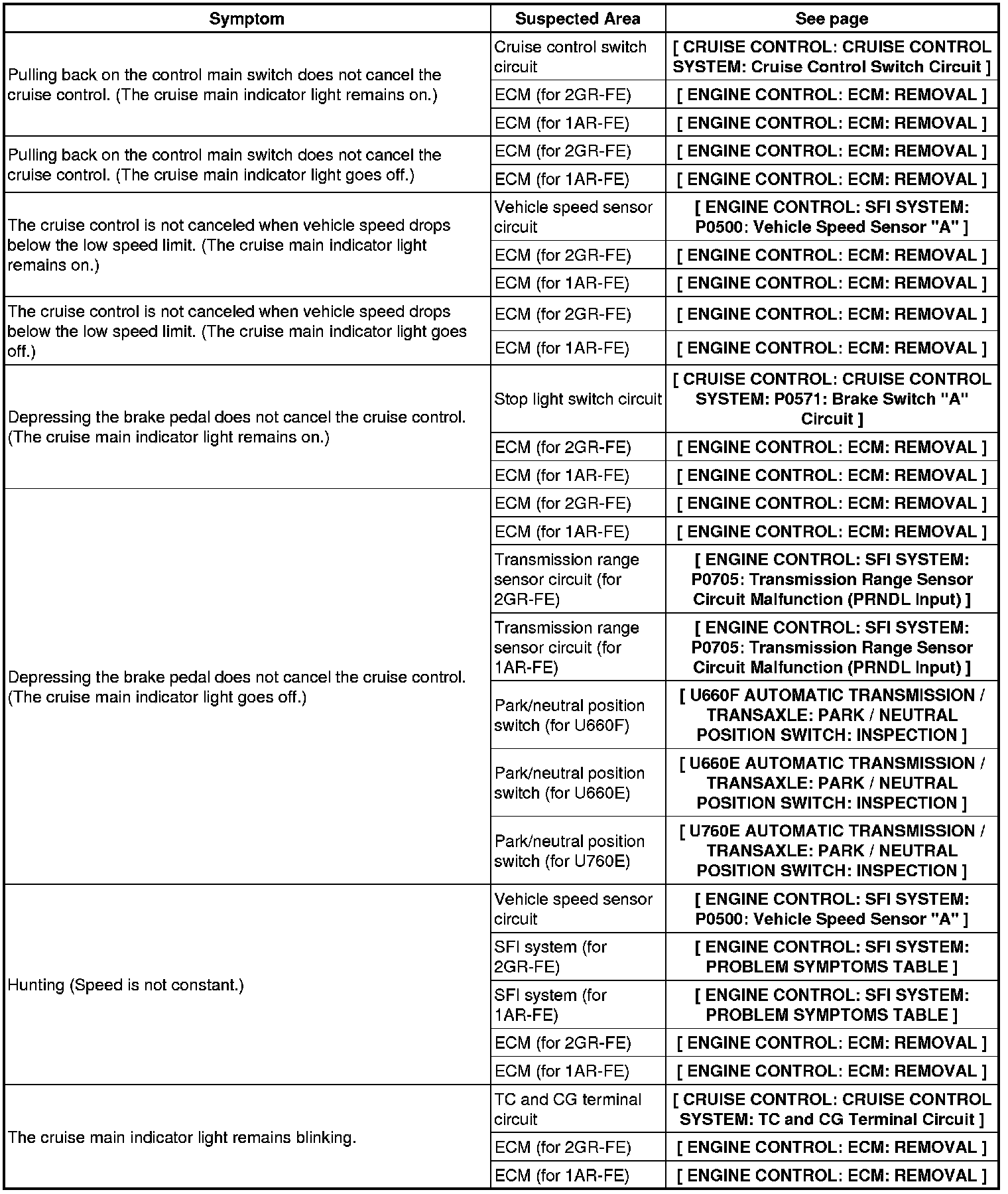 CRUISE CONTROL: CRUISE CONTROL SYSTEM: PROBLEM SYMPTOMS TABLE