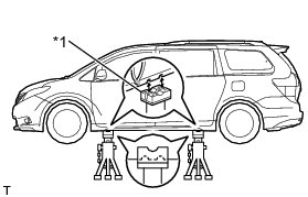 (b) When removing any heavy components like the engine or transaxle, the vehicle center of gravity will shift. To stabilize the vehicle, place a balance weight in a location that will prevent the vehicle from rolling or shifting, or place a transmission jack under the appropriate jack position at the opposite end of the vehicle.