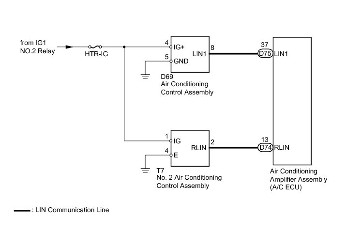 When a switch of the air conditioning control assembly or air conditioning control assembly No. 2 are operated, the air conditioning control assembly or air conditioning control assembly No. 2 uses LIN communication to communicate with air conditioning amplifier assembly. If a switch of the air conditioning control assembly or air conditioning control assembly No. 2 does not operate properly, a problem with the LIN communication between the air conditioning control assembly or air conditioning control assembly No. 2 and air conditioning control amplifier may be causing the malfunction.
