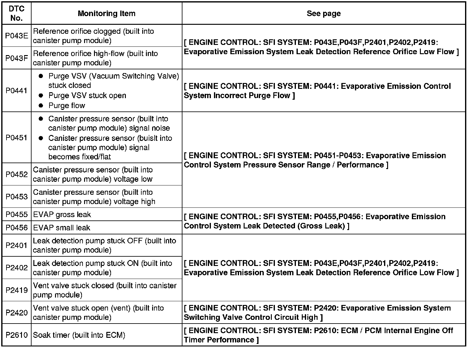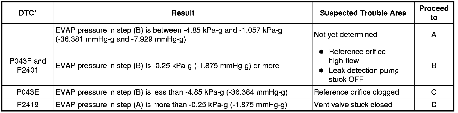 If the reference pressure difference between the first and second checks is more than the specification, all the DTCs relating to the reference pressure (P043E, P043F, P0441, P0455, P0456, P2401, P2420) will all be stored.