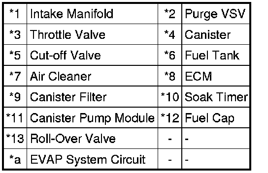 If any EVAP system DTCs are set, the malfunctioning area can be determined using the table below.