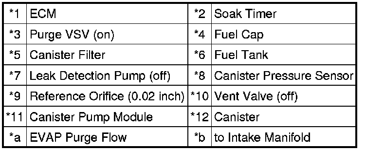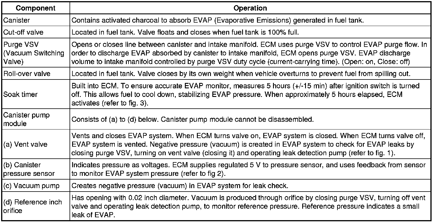 The leak detection pump creates negative pressure (vacuum) in the EVAP system and the pressure is measured. Finally, the ECM monitors for leaks from the EVAP system, and malfunctions in both the canister pump module and purge VSV based on the EVAP pressure.