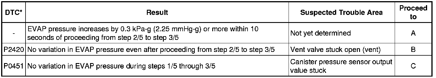 If any EVAP system DTCs are output, the malfunctioning area can be determined using the table below.