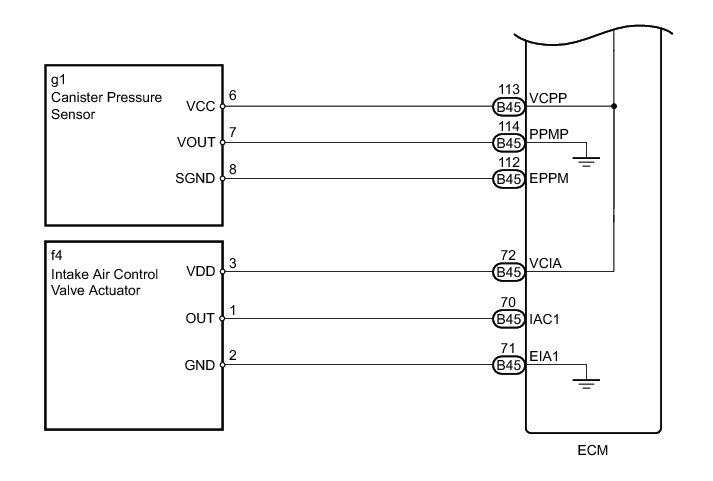 The ECM constantly generates 5 V of power from battery voltage supplied to the +B (BATT) terminal to operate the microprocessor. The ECM also provides this power to the sensors through the VC output circuit.