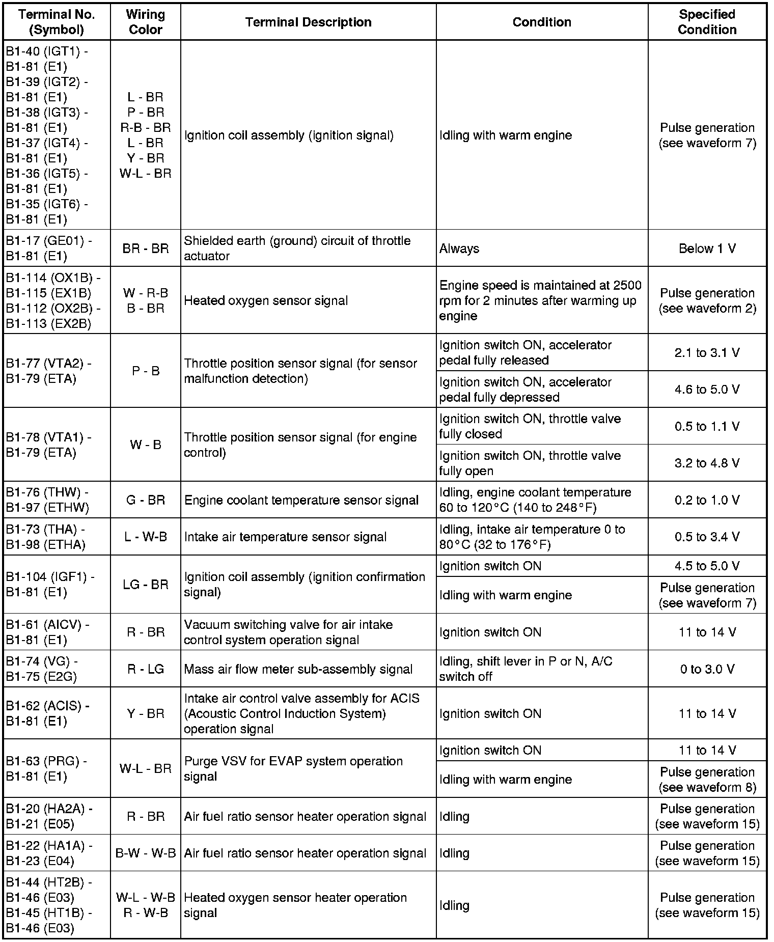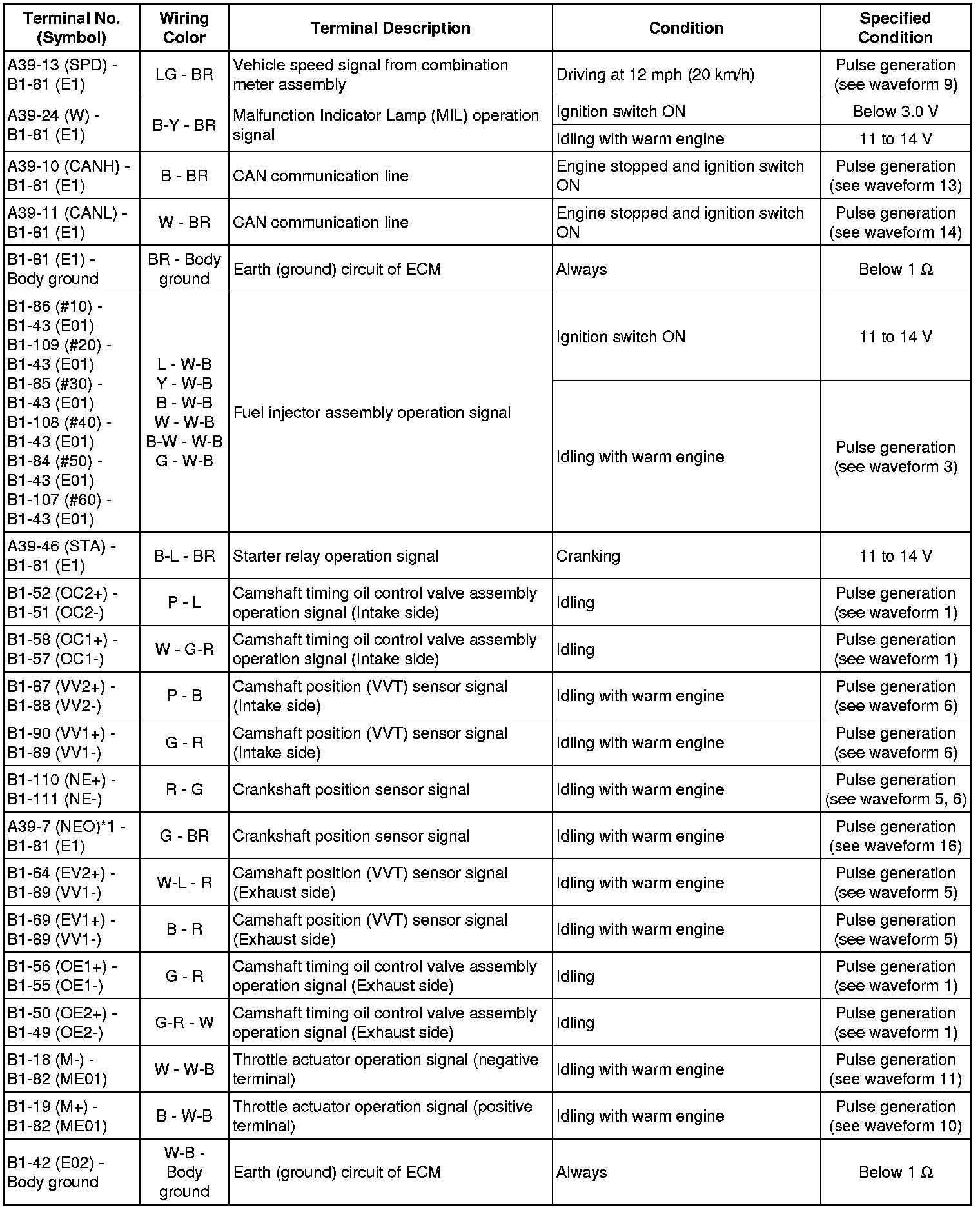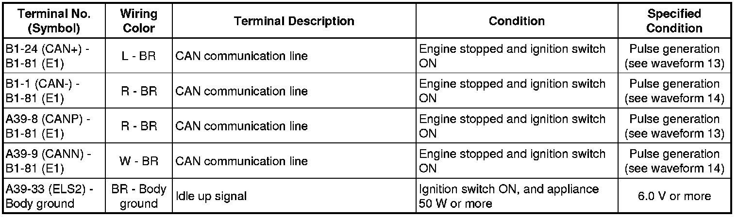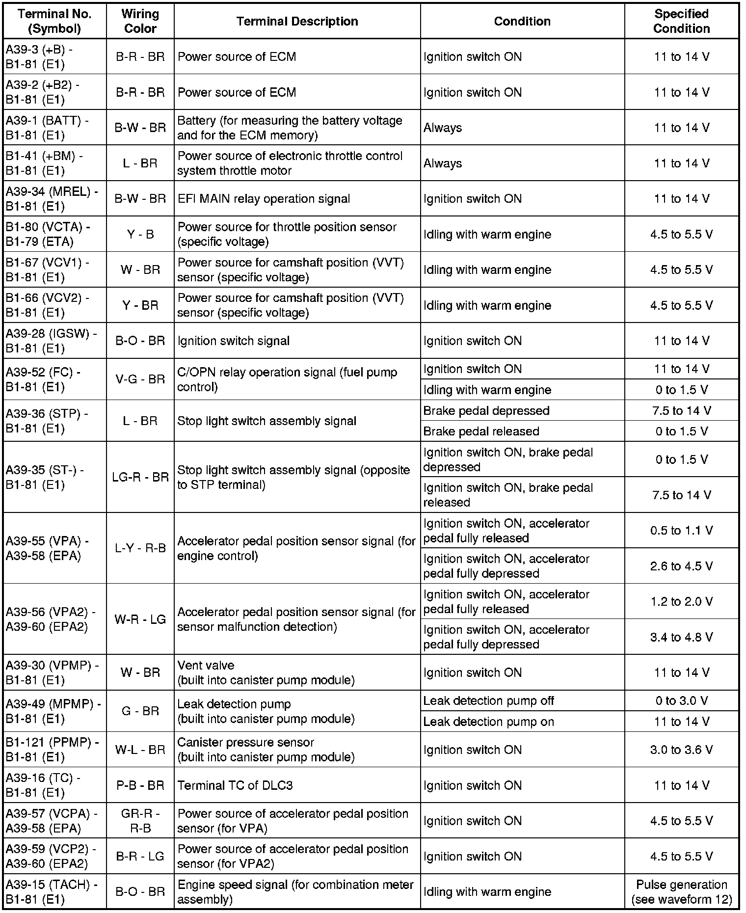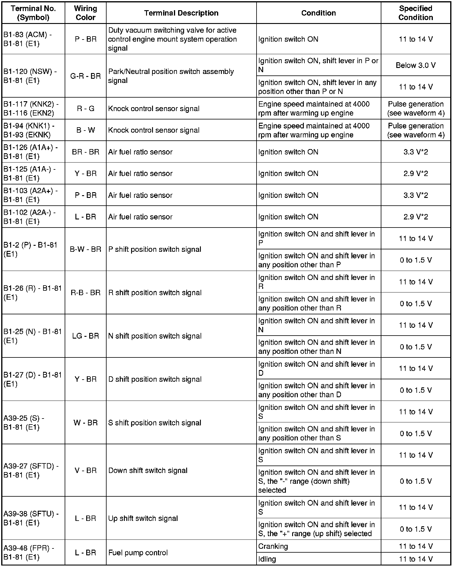 The standard normal voltage between each pair of the ECM terminals is shown in the table below. The appropriate conditions for checking each pair of the terminals are also indicated.
