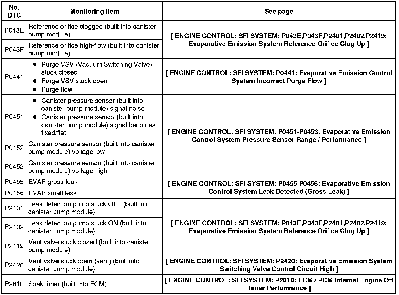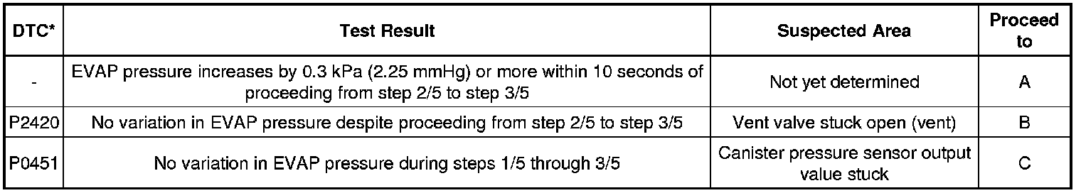 If any EVAP system DTCs are set, the malfunctioning area can be determined using the table below.