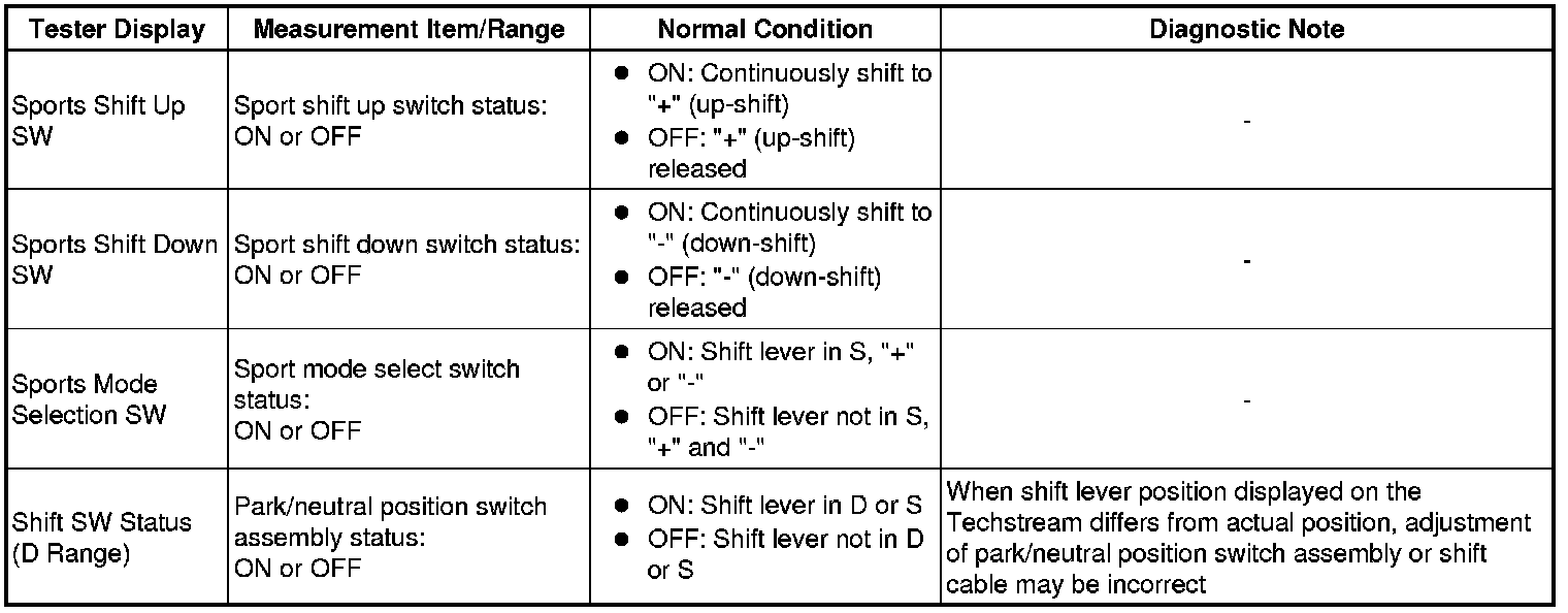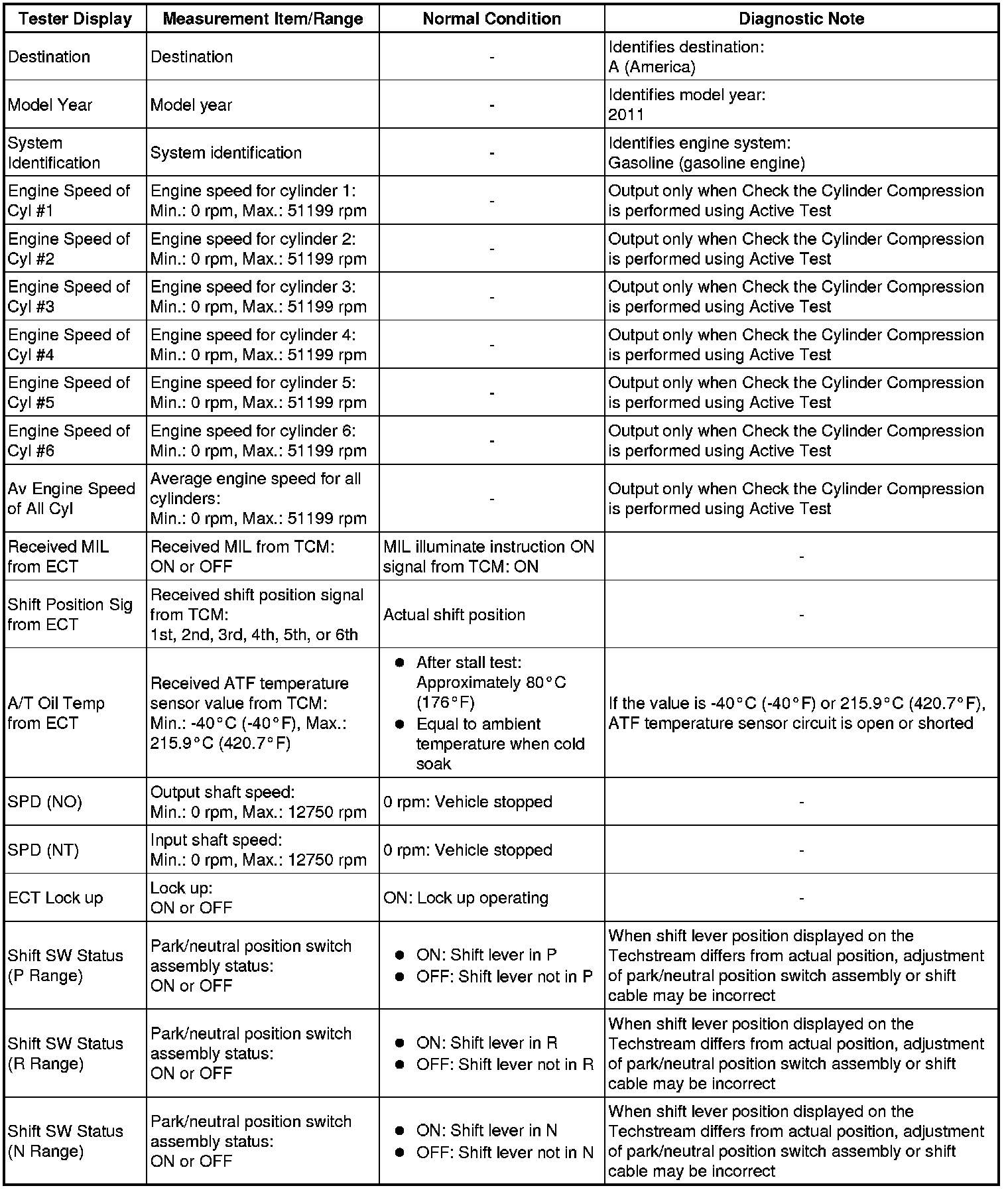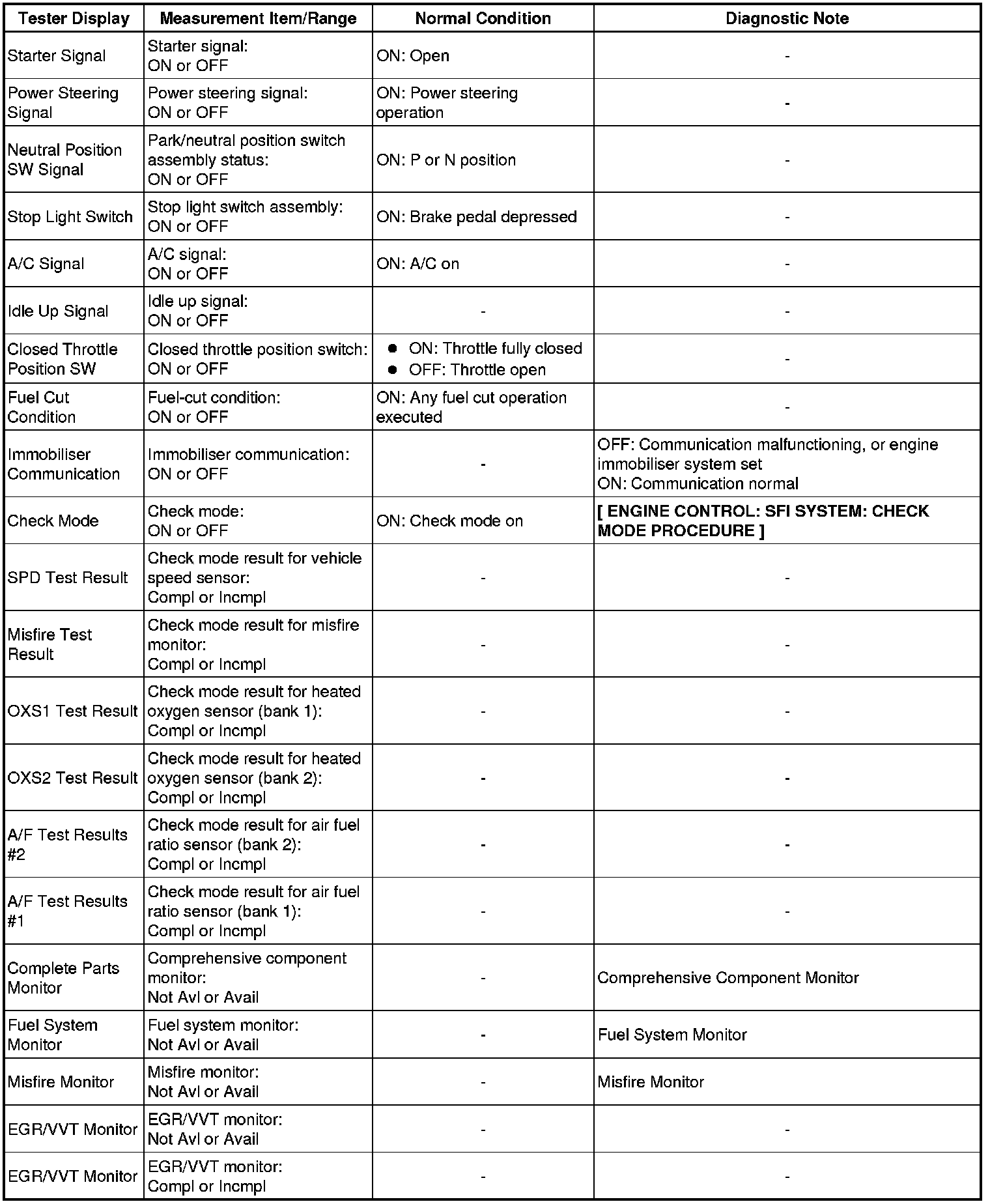 Using the Techstream to read the Data List allows the values or states of switches, sensors, actuators and other items to be read without removing any parts. This non-intrusive inspection can be very useful because intermittent conditions or signals may be discovered before parts or wiring is disturbed. Reading the Data List information early in troubleshooting is one way to save diagnostic time.