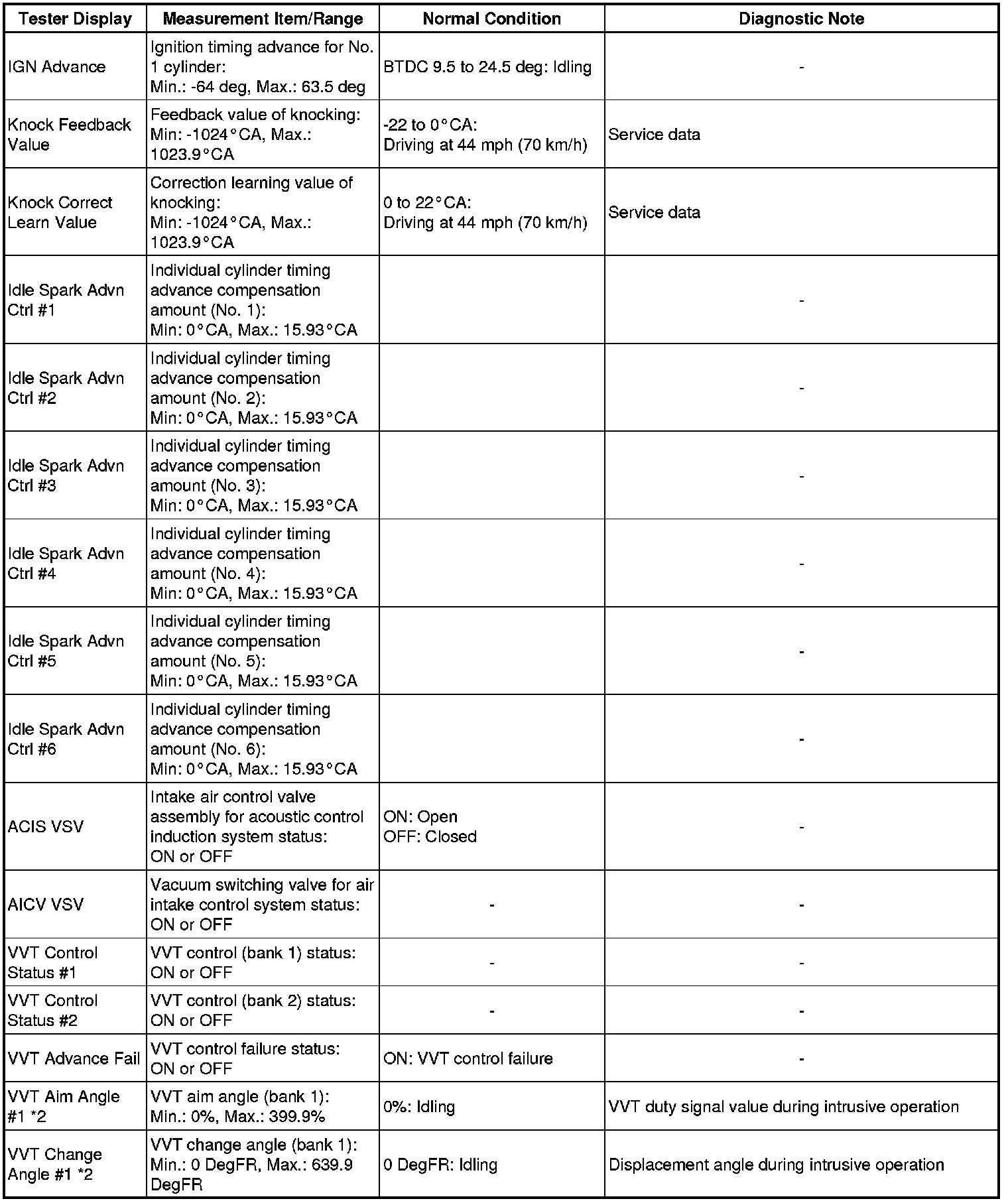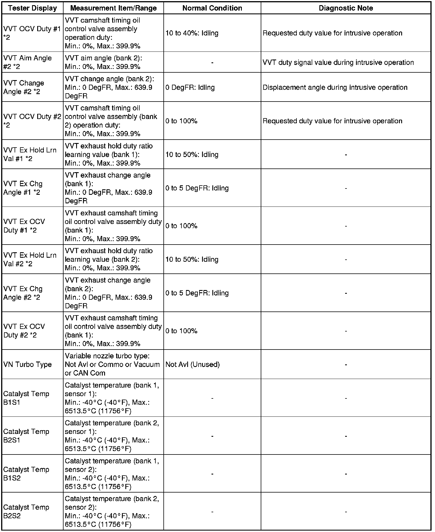 * *2: Data List values are only displayed when performing the following Active Test: Control the VVT System (Bank 1, 2), Control the VVT Linear (Bank 1, 2) and Control the VVT Exhaust Linear (Bank 1, 2). For other Active Test, the Data List value will be 0.
