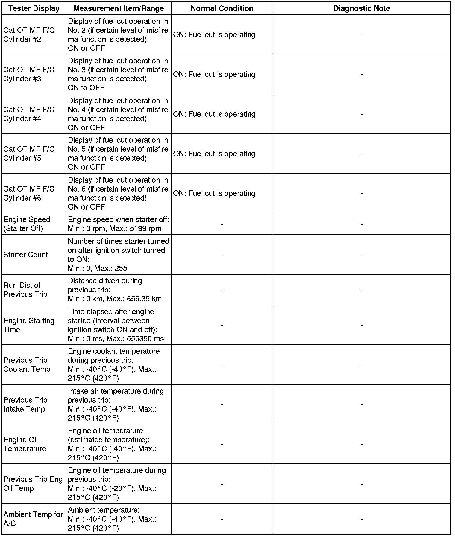 At first, the Techstream display will show each cylinders engine speed measurement to be extremely high. After approximately 10 seconds of engine cranking, each cylinders engine speed measurement will change to the actual engine speed.