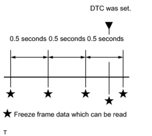 The ECM records engine conditions in the form of freeze frame data every 0.5 seconds. Using the Techstream, 5 separate sets of freeze frame data, including the data values at the time when the DTC was set, can be checked.