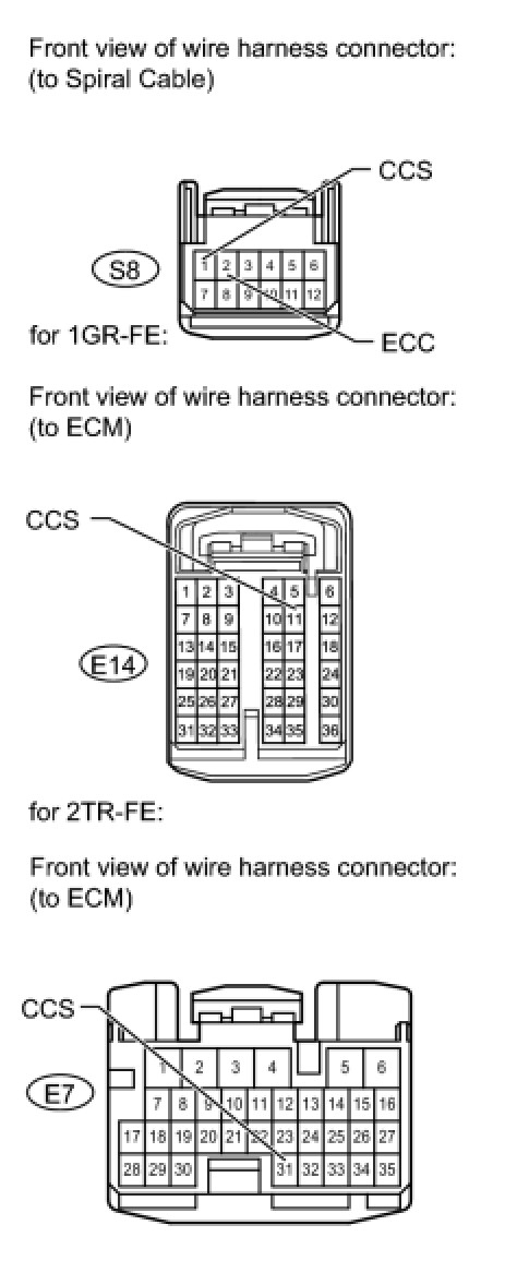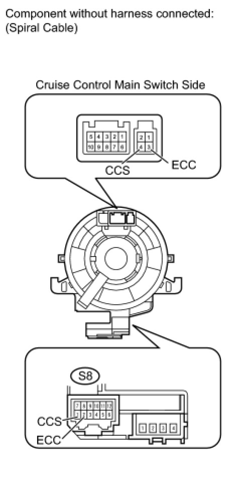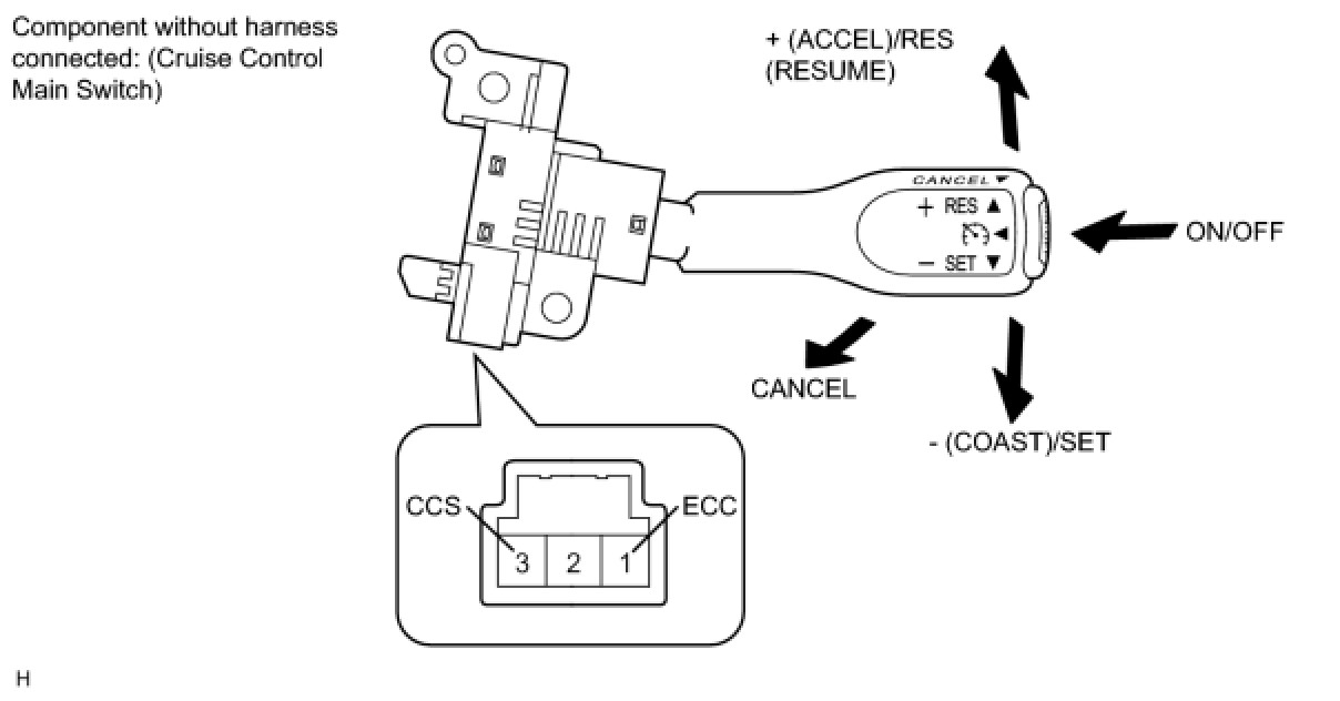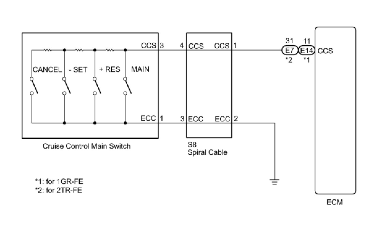 The battery supplies the positive (+) battery voltage to the cruise control main switch. Then terminal CCS of the ECM receives the voltage as the signal according to the switch condition.