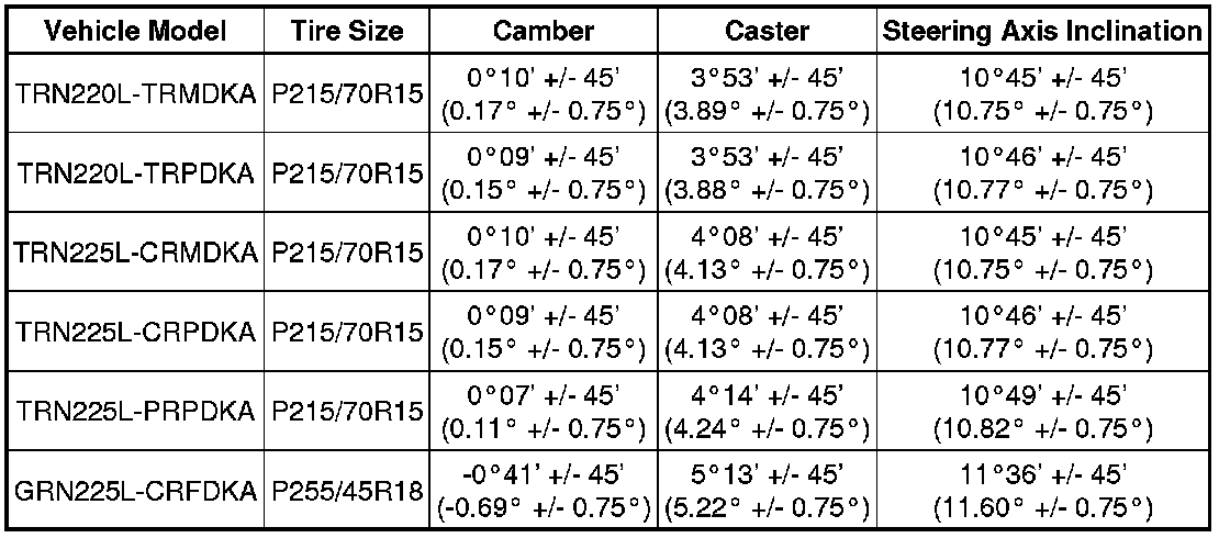 * The tolerance for the difference between the left and right wheels is 0°30' (0.50°) or less for both the camber and caster.