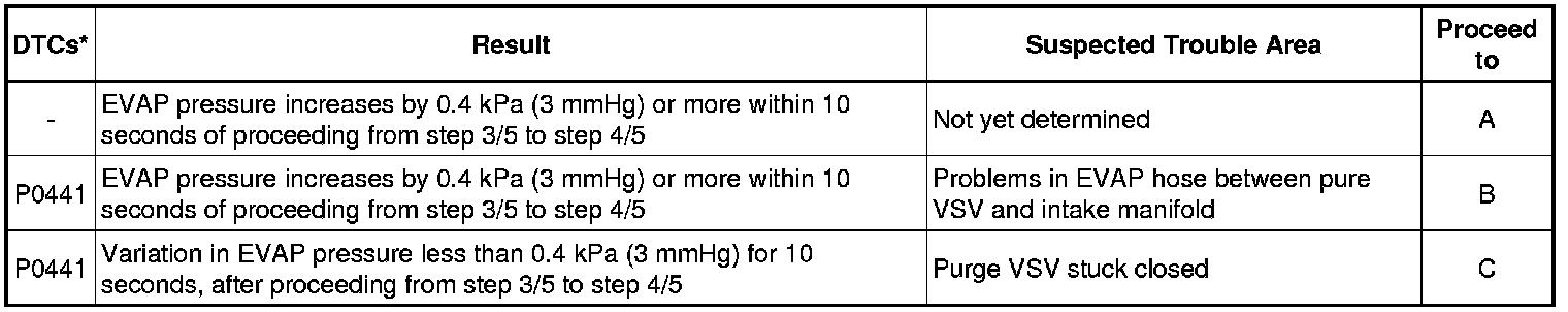 The vent valve is turned OFF (open) and the EVAP pressure is then measured. If the variation in the pressure is less than 0.5 kPa (3.75 mmHg), the ECM interprets this as the purge VSV being stuck closed, and illuminates the MIL and sets DTC P0441 (2 trip detection logic).