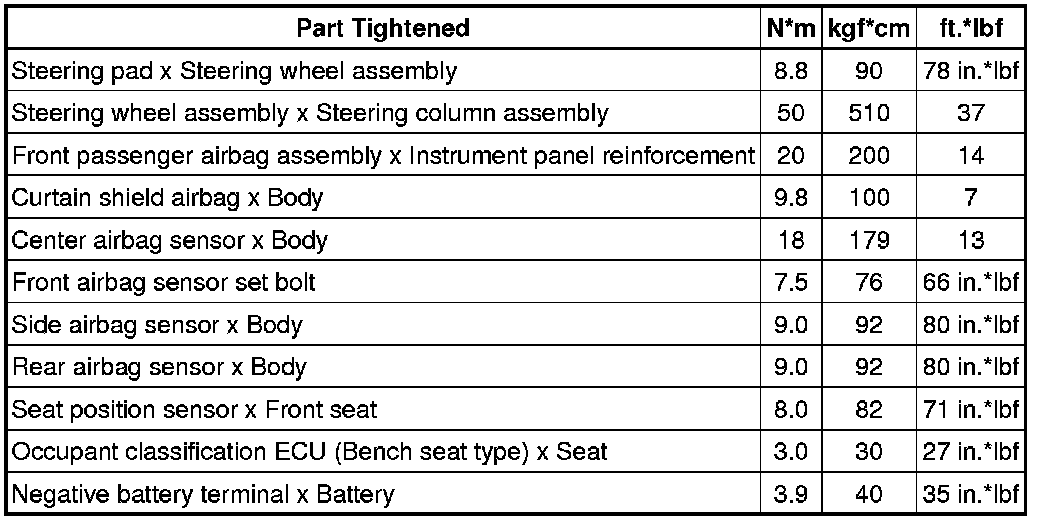 SERVICE SPECIFICATIONS: SUPPLEMENTAL RESTRAINT SYSTEM: TORQUE SPECIFICATIONS