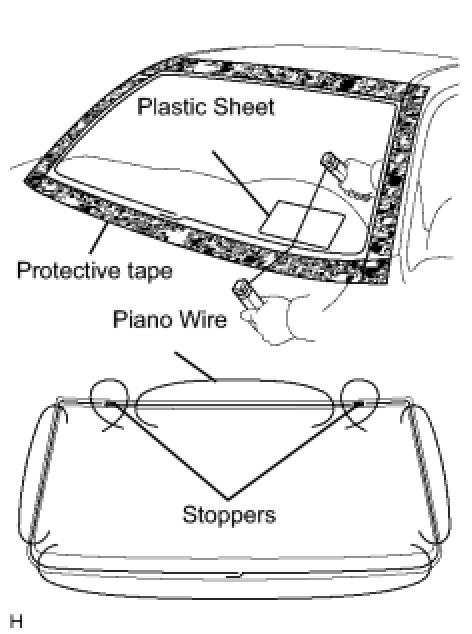 (b) From the interior, insert piano wires between the vehicle body and windshield glass, as shown in the illustration.