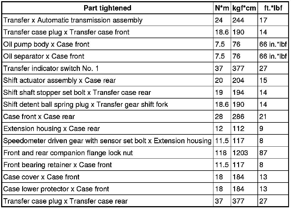 SERVICE SPECIFICATIONS: VF2BM TRANSFER: TORQUE SPECIFICATIONS