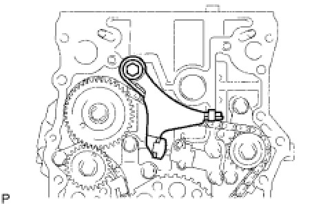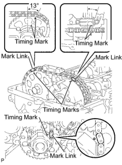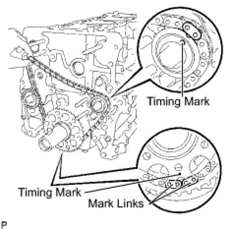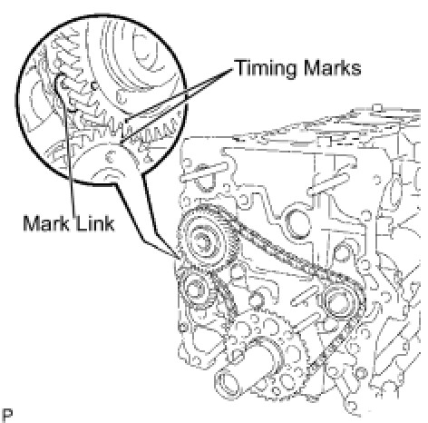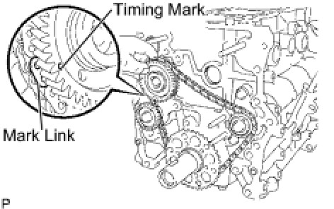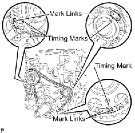 (a) As shown in the illustration, install the chain onto the sprocket and gear with the painted marks aligned with the timing marks on the sprocket and gear.
