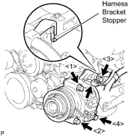 (a) Provisionally tighten the compressor and magnetic clutch with the 4 bolts and harness bracket.