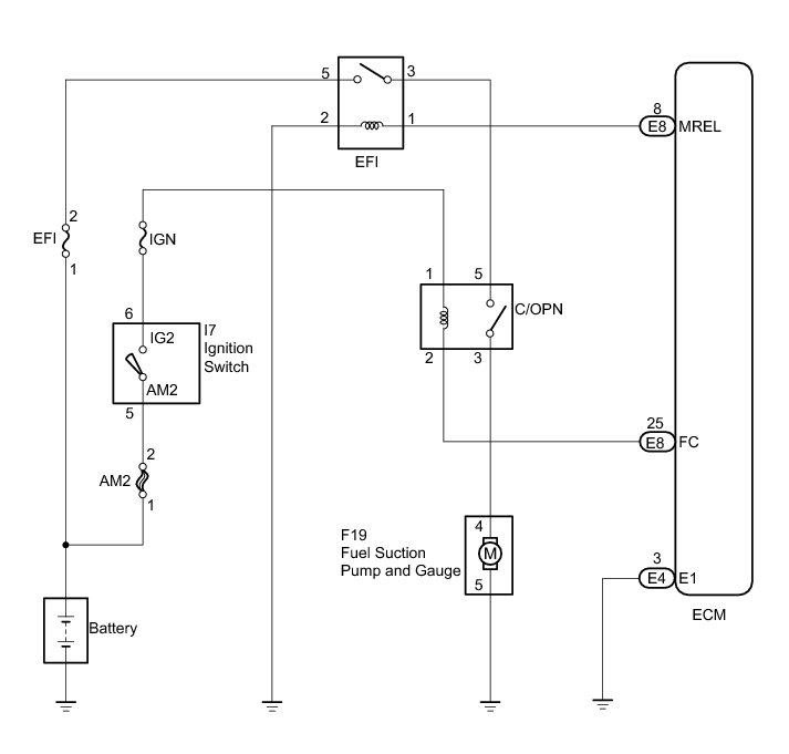 While the NE signal is being generated (engine running), the ECM keeps Tr ON, therefore keeping the circuit opening relay ON, so that the fuel pump continues to operate.