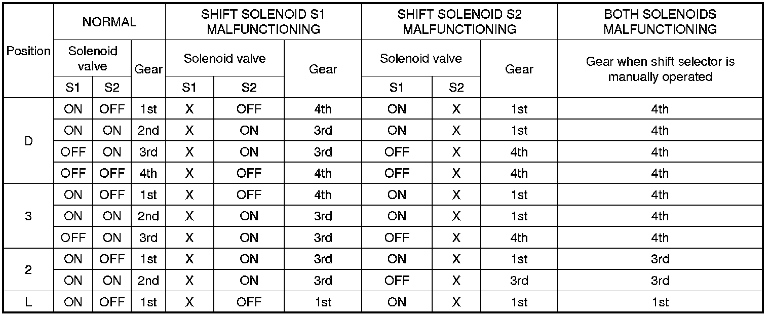 If either of the shift solenoid valve circuits has an open or short failure, the ECM turns the other shift solenoid "ON" and "OFF" in order to shift into the gear positions shown in the table below.