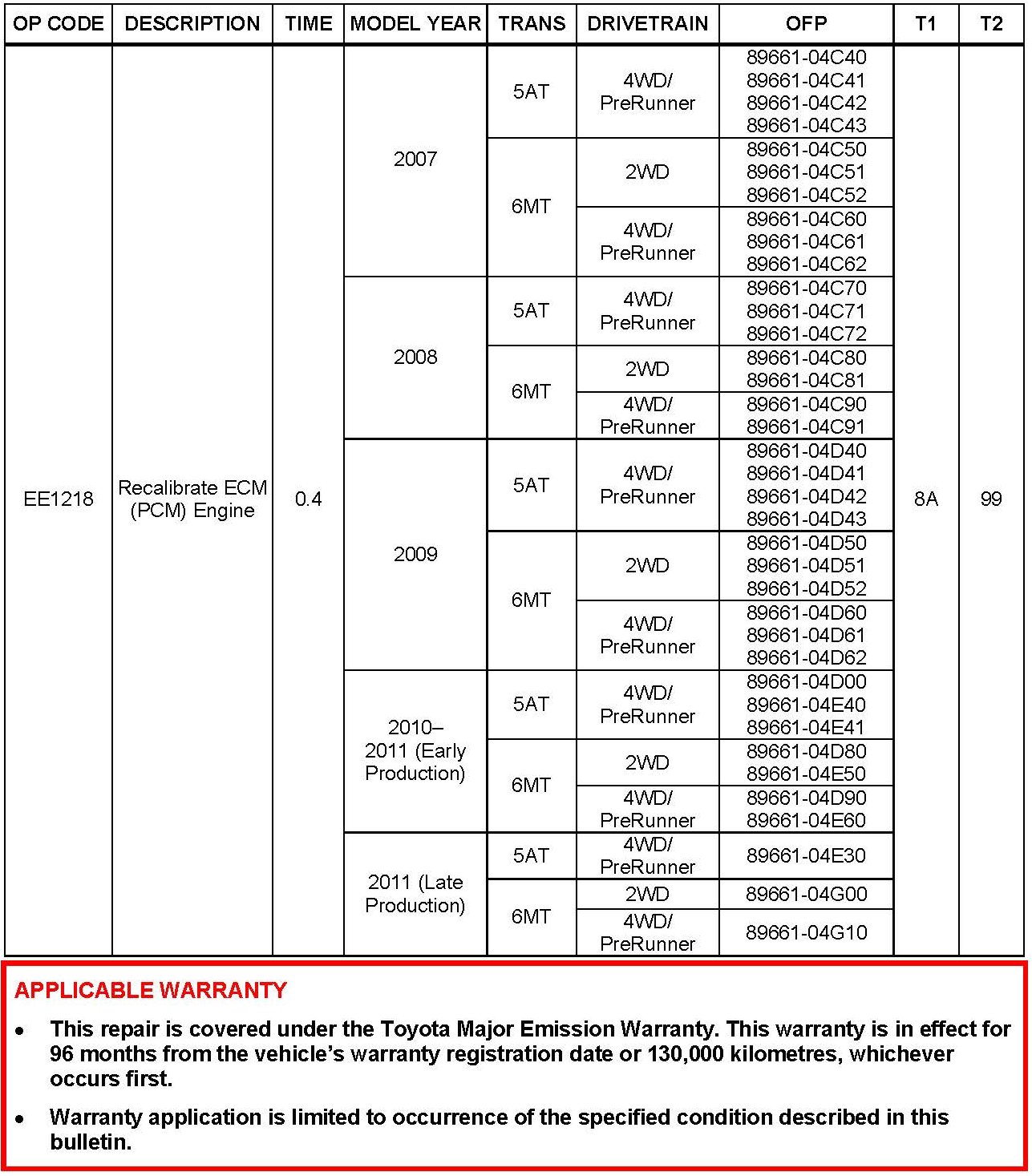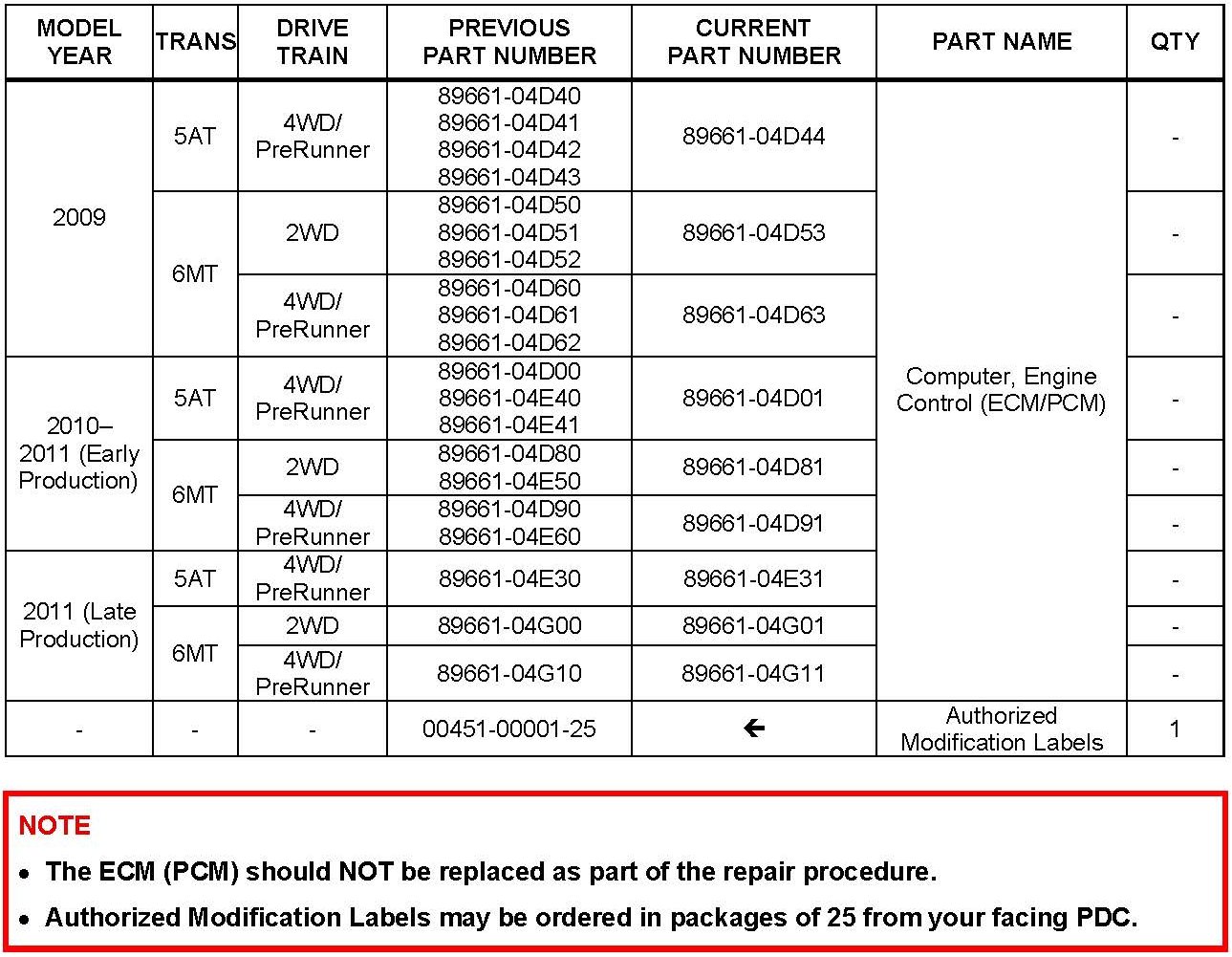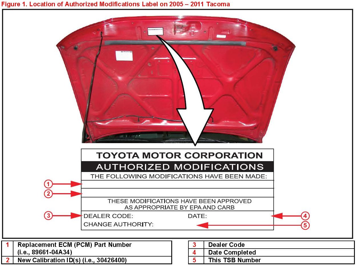 Some 2005 - 2011 model year Tacoma vehicles with a 1GR-FE engine may exhibit a MIL "ON" condition with Diagnostic Trouble Code (DTC) P0456 - Evaporative Emission Control System Leak Detected (Very Small Leak) - when no leak is present. The Engine Control Module/ECM (SAE term Powertrain Control Module/PCM) logic has been modified to reduce the possibility of this condition occurring. Use the following repair procedure to address this condition