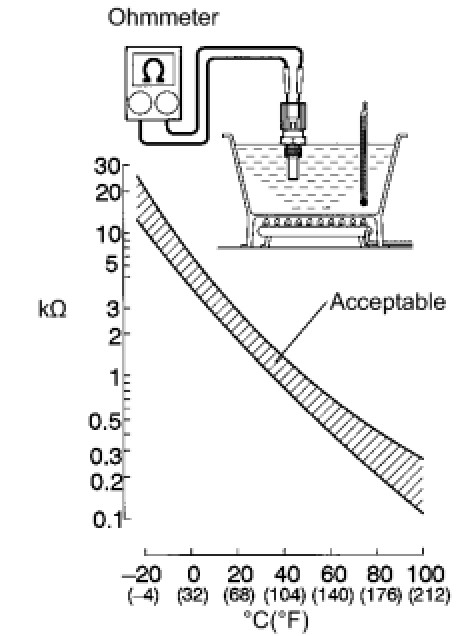 If checking the engine coolant temperature sensor in water, be careful not to allow water to enter the terminals. After checking, wipe the water off the engine coolant temperature sensor.