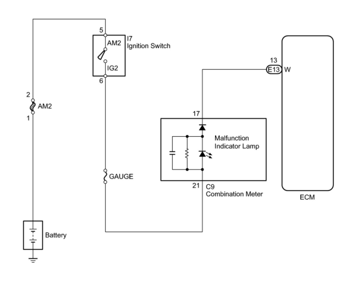 By turning the ignition switch to ON, power is supplied to the MIL circuit, and the ECM provides the circuit ground which illuminates the MIL.