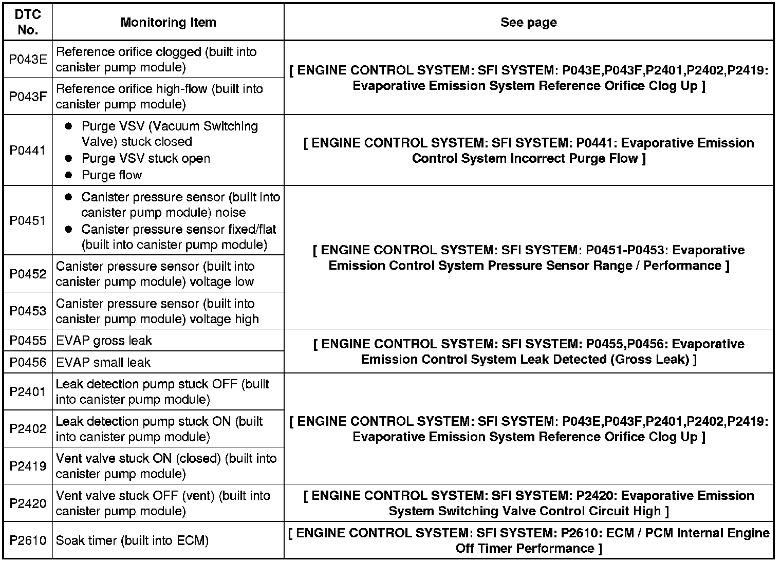 If any EVAP system DTCs are set, the malfunctioning area can be determined using the table below.