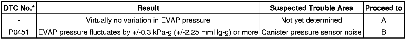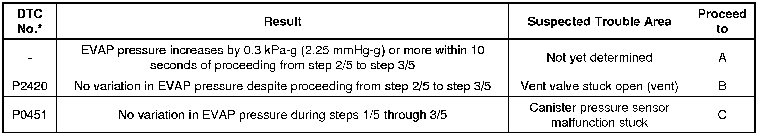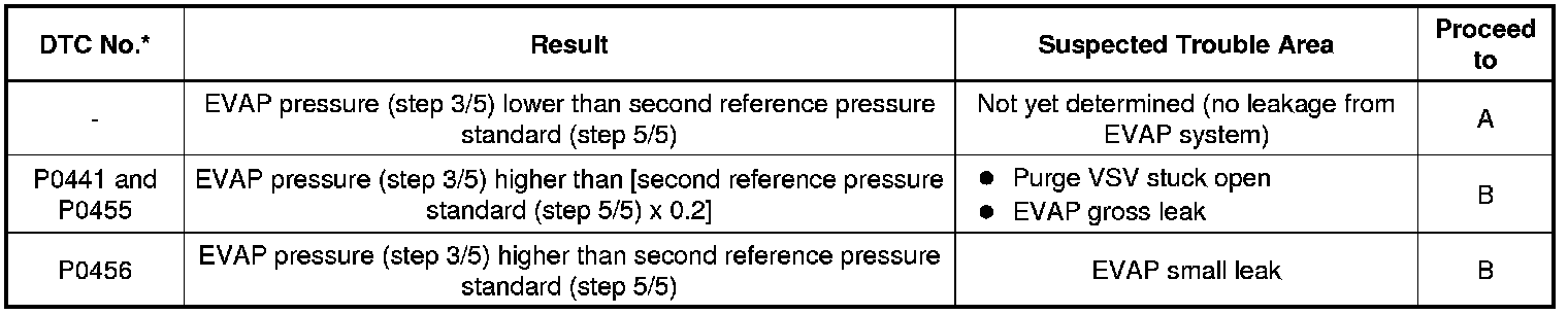 If the reference pressure difference between the first and second checks is greater than the specification, the DTCs corresponding to the reference pressure (P043E, P043F, P2401, P2402 and P2419) will all be stored.