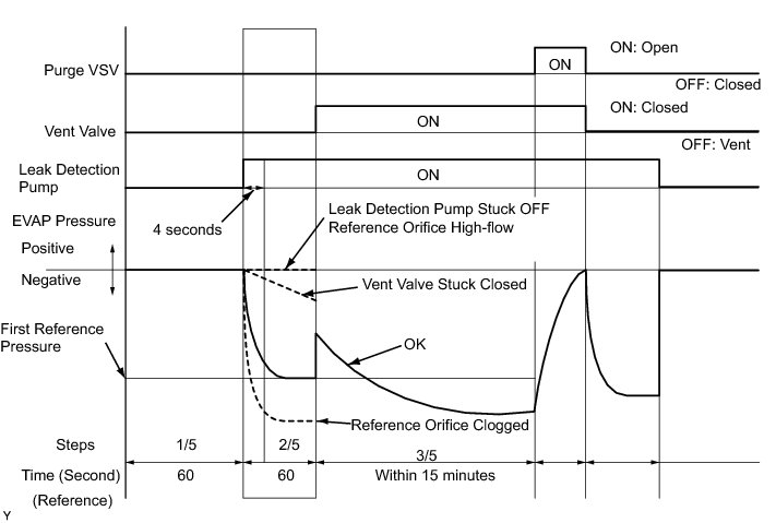 (b) Compare the EVAP pressure in step 3/5 and the second reference pressure standard (step 5/5).