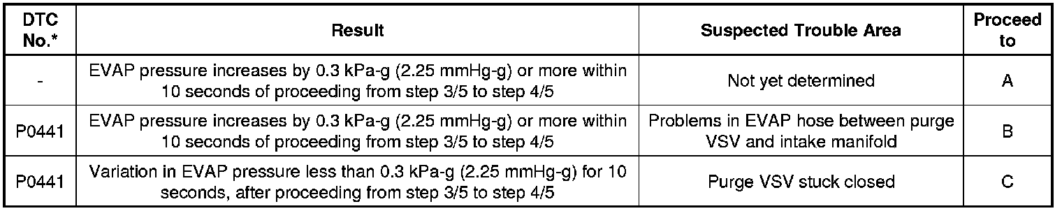 The vent valve is turned OFF (open) and the EVAP pressure is then measured. If the variation in the pressure is less than 0.5 kPa (3.75 mmHg), the ECM interprets this as the purge VSV being stuck closed, illuminates the MIL and sets DTC P0441 (2 trip detection logic).