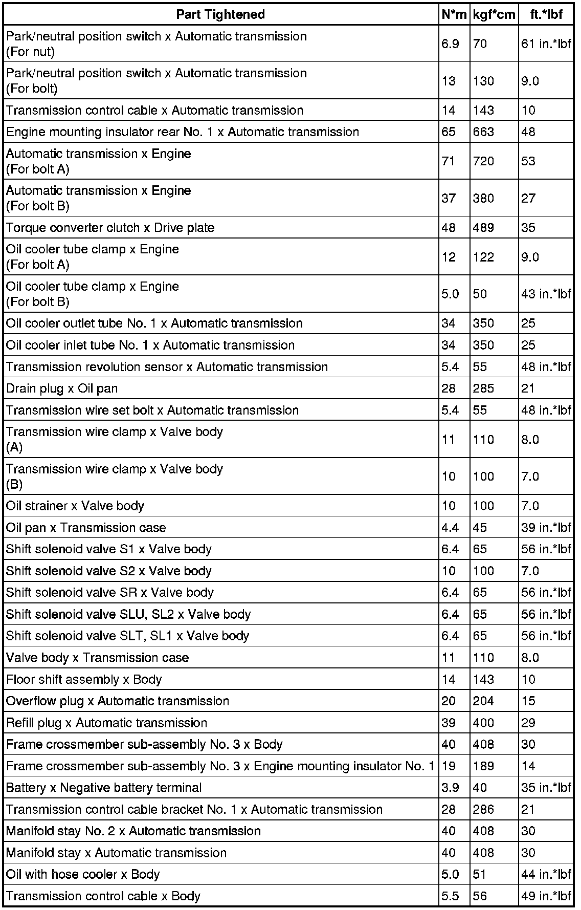 SERVICE SPECIFICATIONS: A750F AUTOMATIC TRANSMISSION: TORQUE SPECIFICATIONS