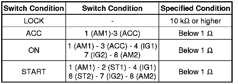 If the result is not as specified, replace the ignition switch.