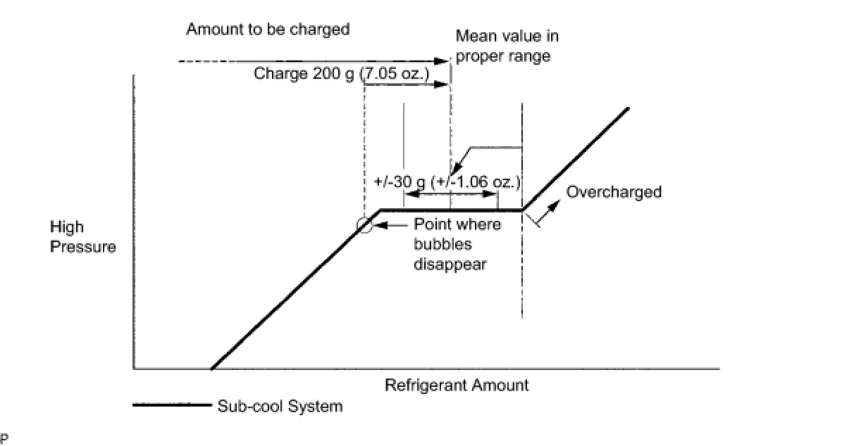 * Approximately 200 g (7.05 oz.) of refrigerant may need to be charged after bubbles disappear. The refrigerant amount should be checked by measuring its quantity, and not with the sight glass.