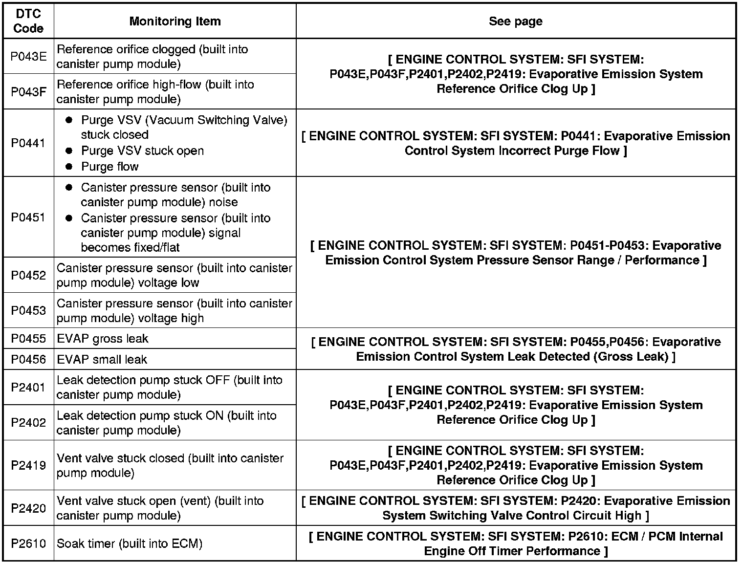 The leak detection pump creates negative pressure (vacuum) in the EVAP system and the pressure is measured. Finally, the ECM monitors for leaks from the EVAP system, and malfunctions in both the canister pump module and purge VSV, based on the EVAP pressure.