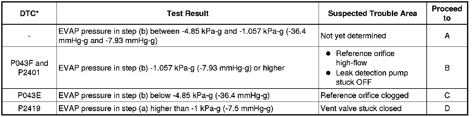 If the reference pressure difference between the first and second checks is greater than the specification, all the DTCs relating to the reference pressure (P043E, P043F, P2401, P2402 and P2419) are stored.