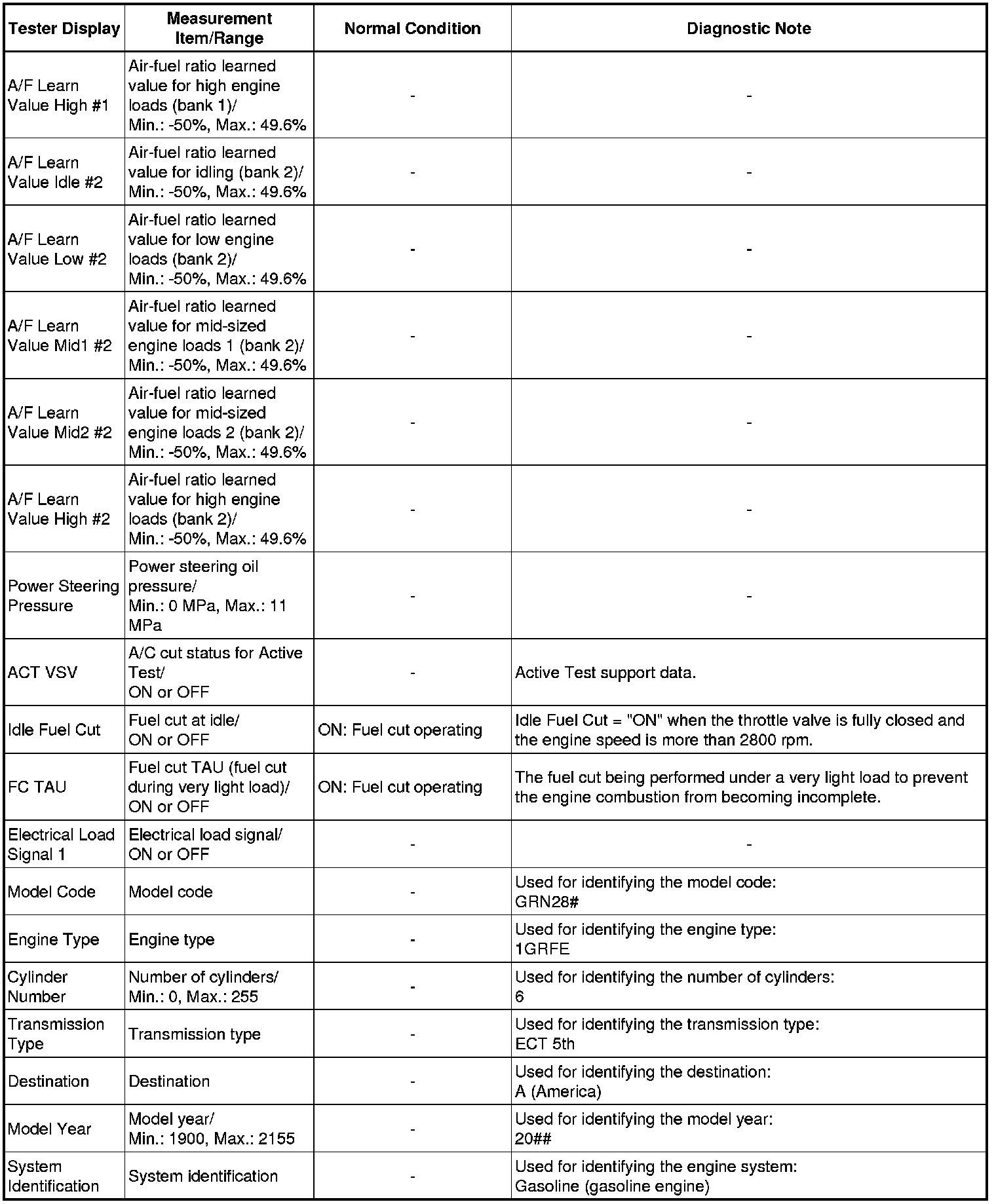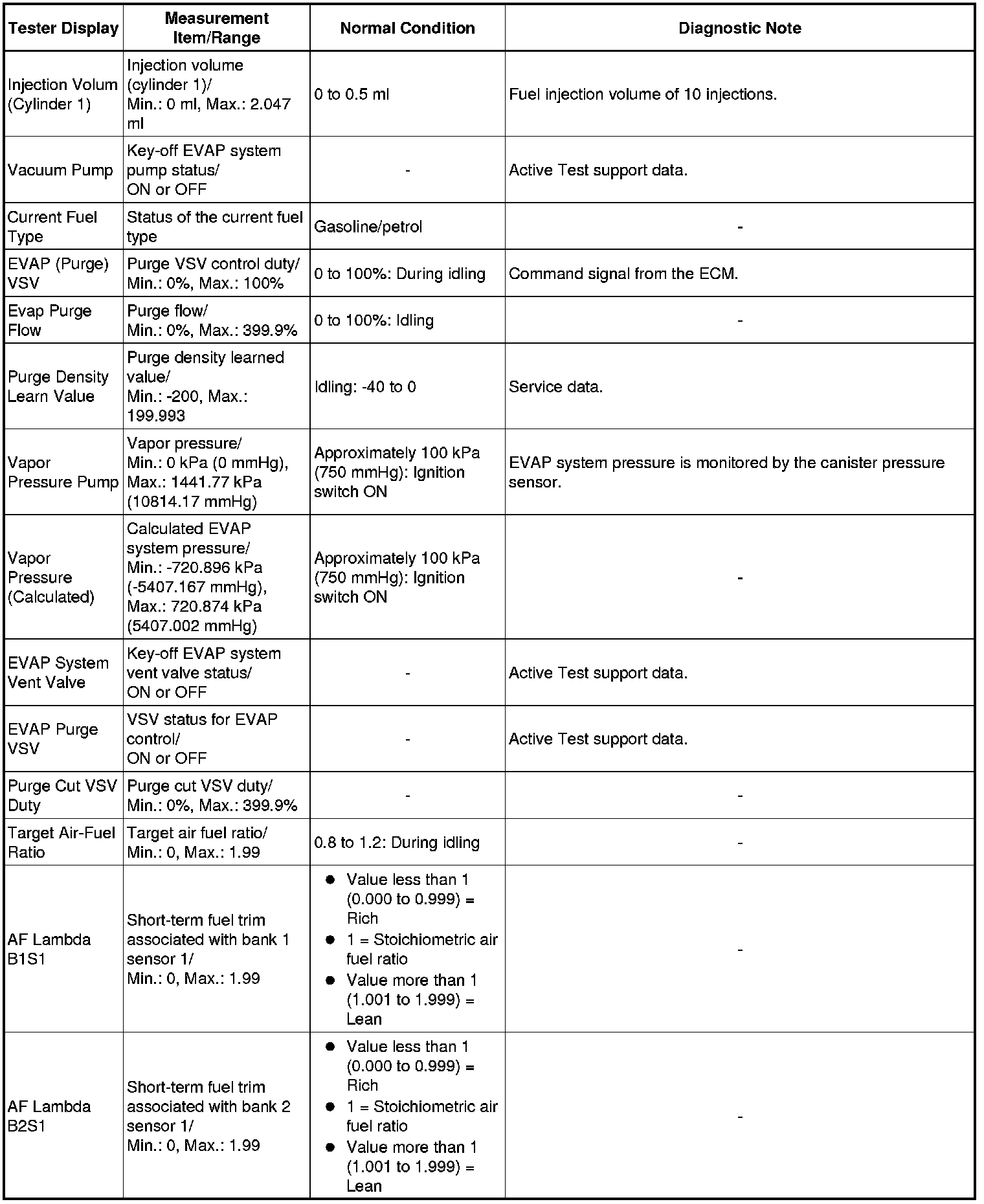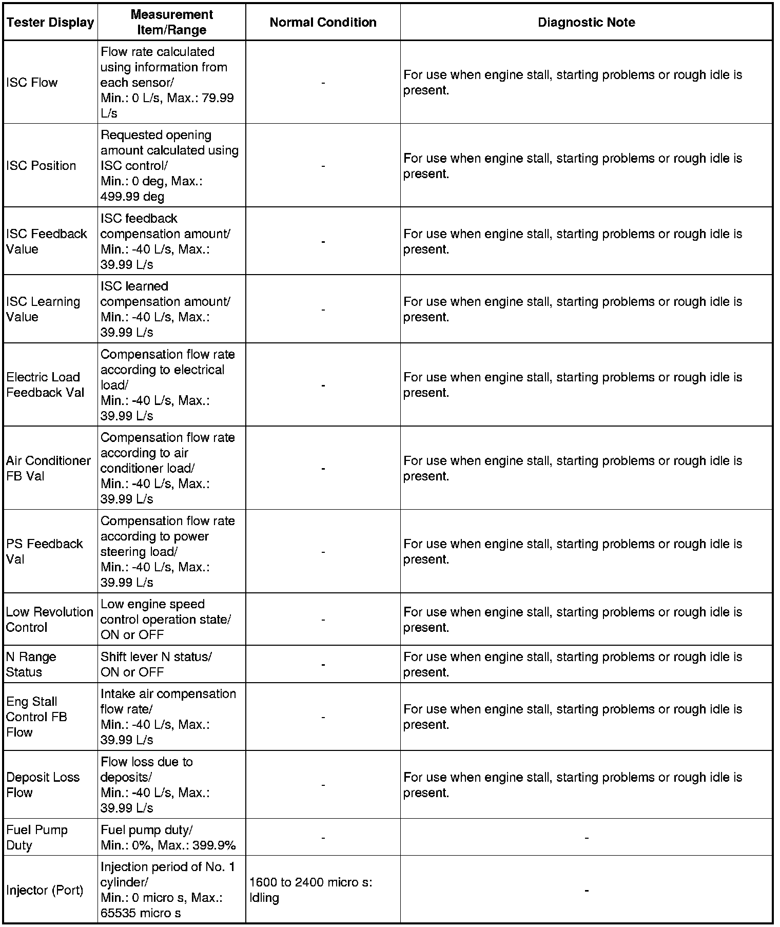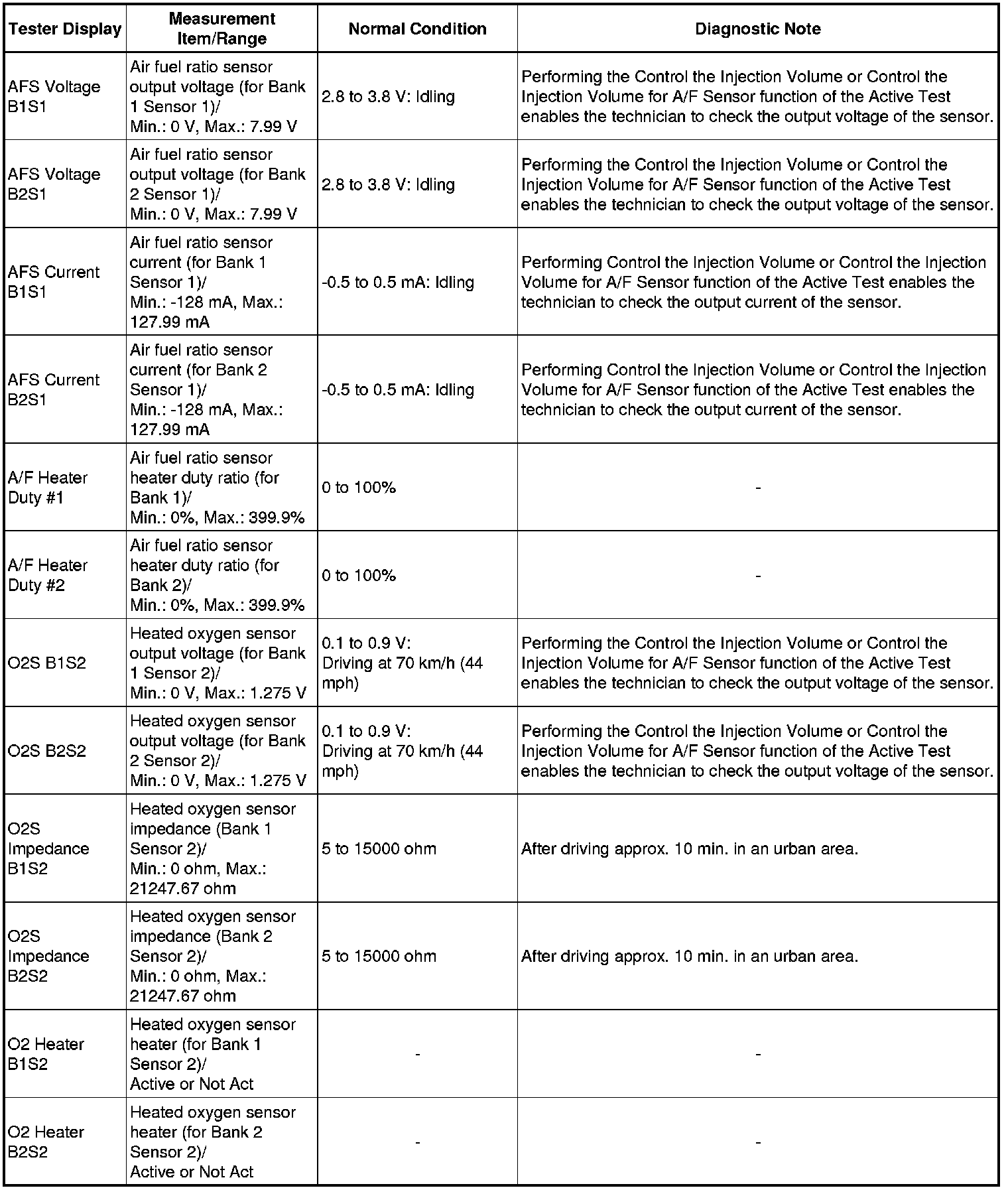 Normal Condition: If no conditions are specifically stated for "idling", the shift lever should be in N or P, the A/C switch should be off and all accessory switches should be off.