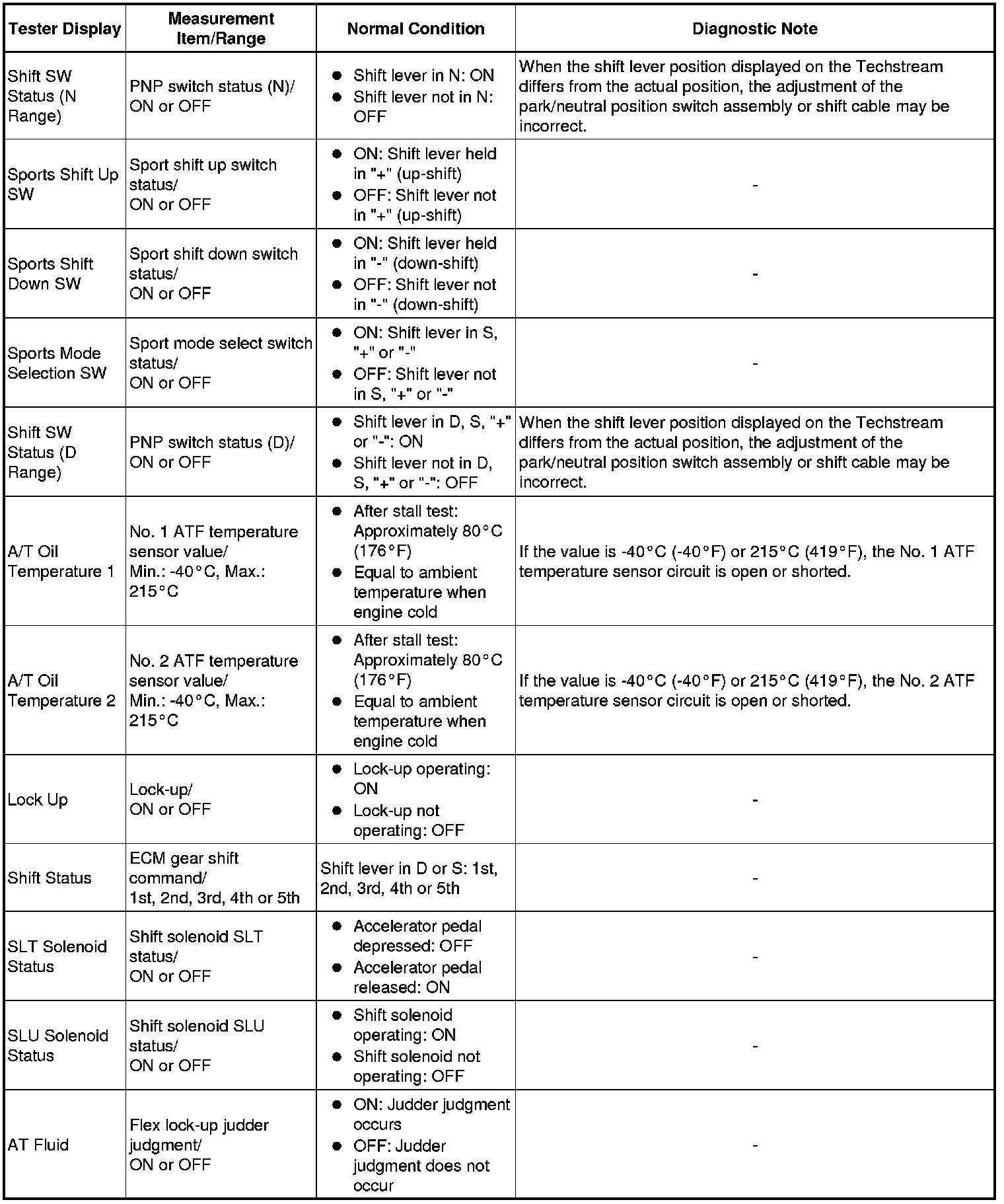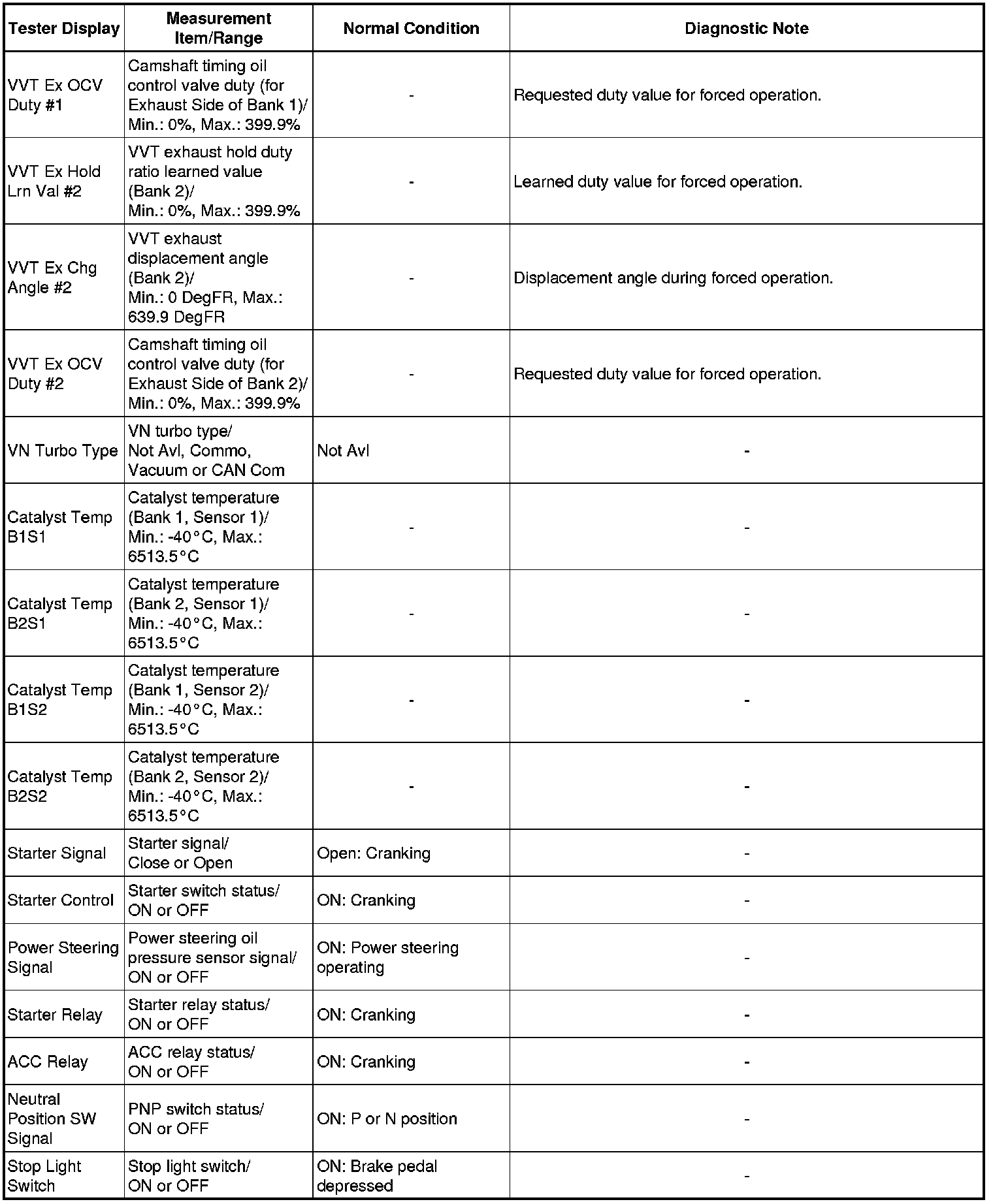 Using the Techstream to read the Data List allows the values or states of switches, sensors, actuators and other items to be read without removing any parts. This non-intrusive inspection can be very useful because intermittent conditions or signals may be discovered before parts or wiring is disturbed. Reading the Data List information early in troubleshooting is one way to save diagnostic time.