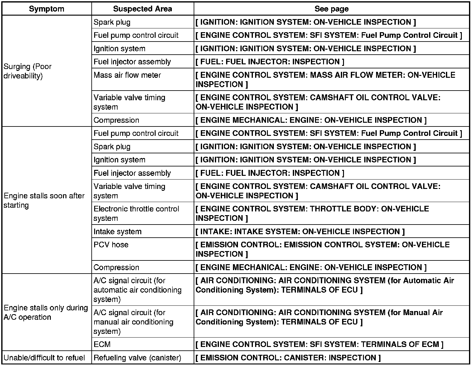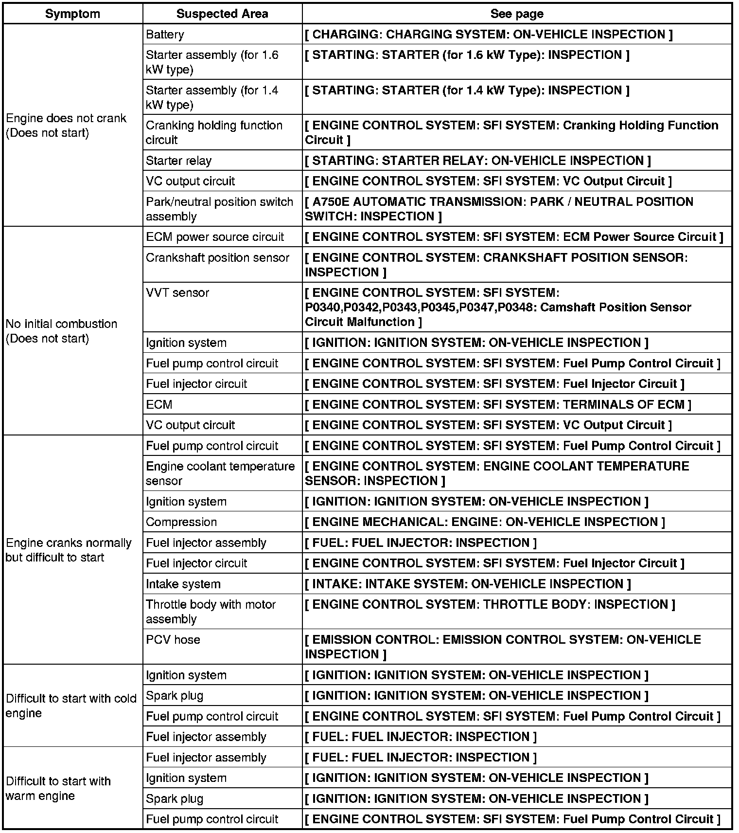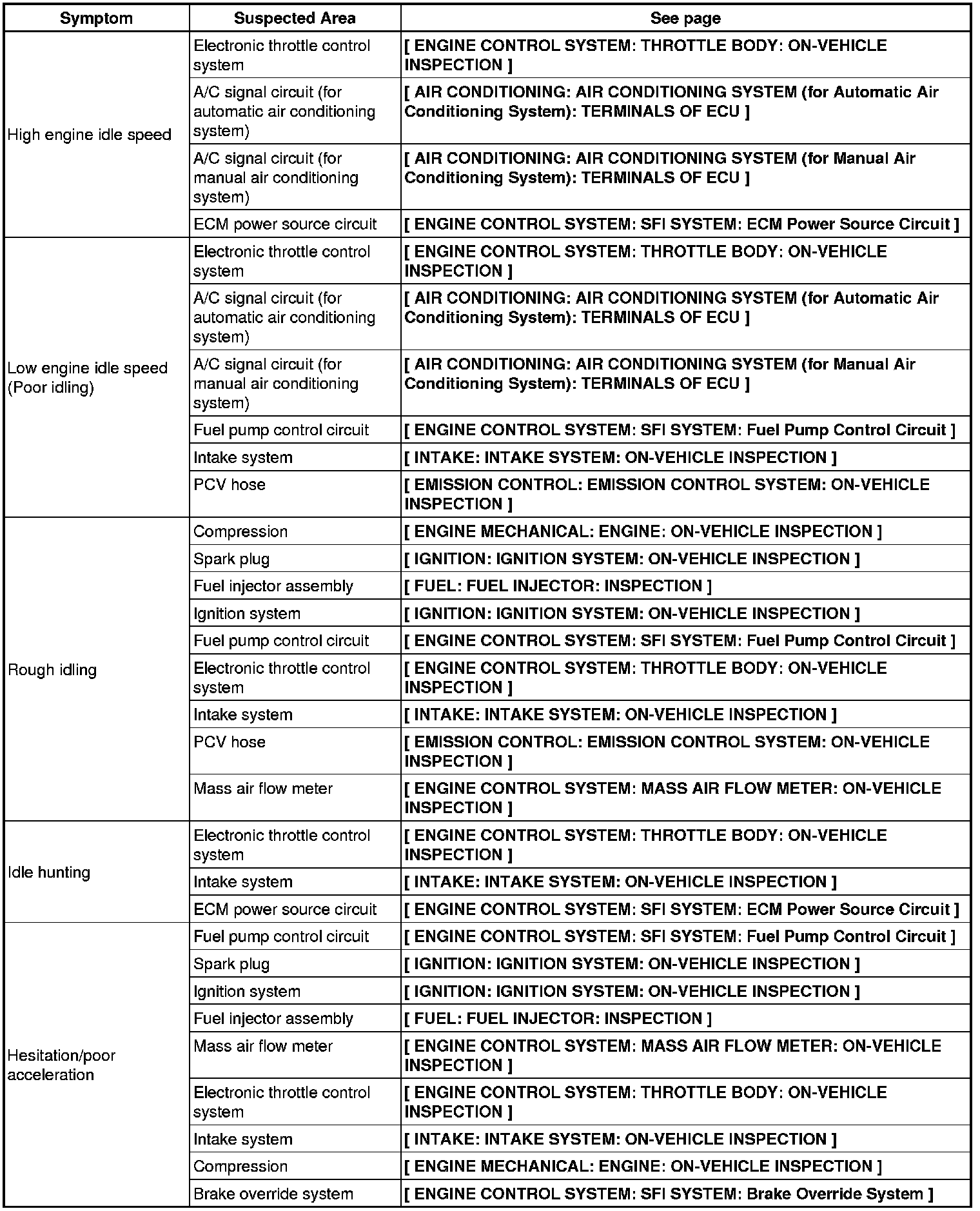 1GR-FE ENGINE CONTROL SYSTEM: SFI SYSTEM: PROBLEM SYMPTOMS TABLE