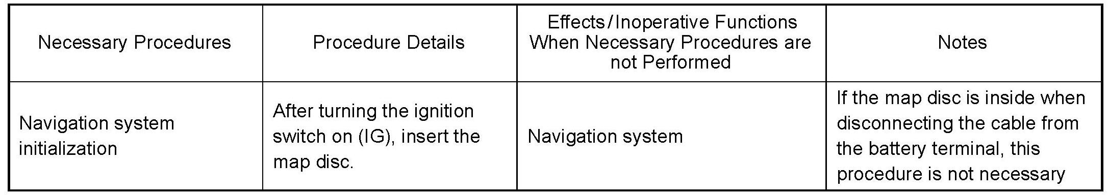 PROCEDURES NECESSARY WHEN BATTERY TERMINAL IS DISCONNECTED/RECONNECTEDNOTE: After the ignition switch is turned OFF, the navigation system requires approximately 90 seconds to record various types of memory and settings. As a result, after turning the ignition switch OFF, wait 90 seconds or more before disconnecting the cable from the negative (-) battery terminal.