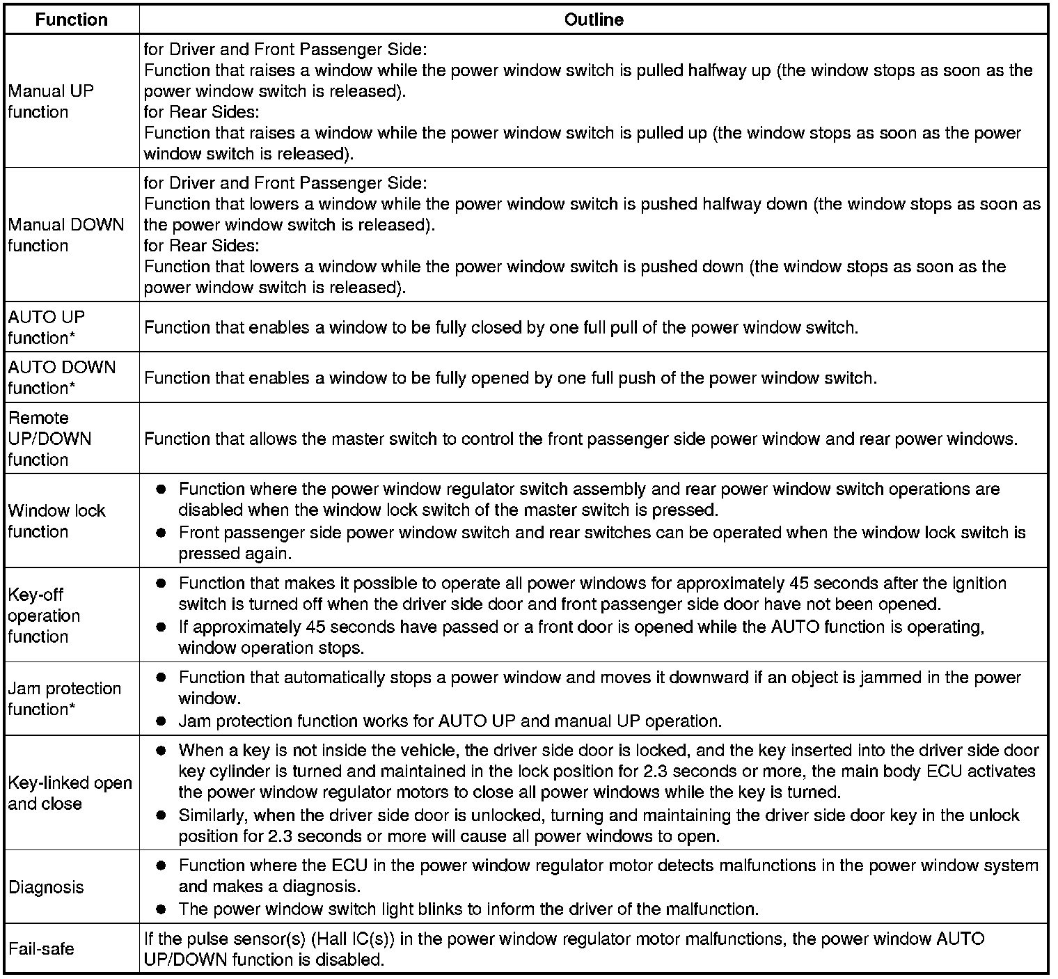 The power window control system controls the power window UP/DOWN function using the power window regulator motor. The main controls of this system are the master switch, which is built into the driver side door, and the power window regulator switches, which are built into the front passenger side door and rear doors.