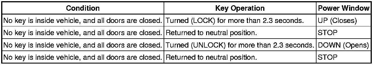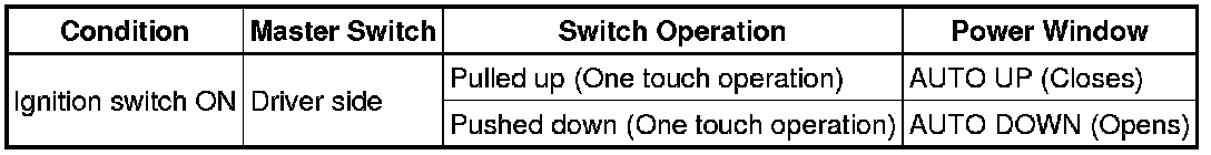 The jam protection function is operative during both AUTO UP and MANUAL UP operation while the engine is running or the ignition switch is ON, and also for 45 seconds after the ignition switch is turned OFF.