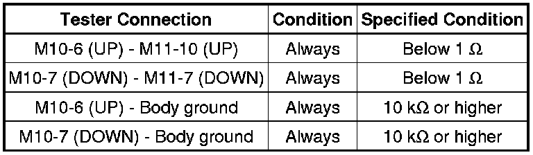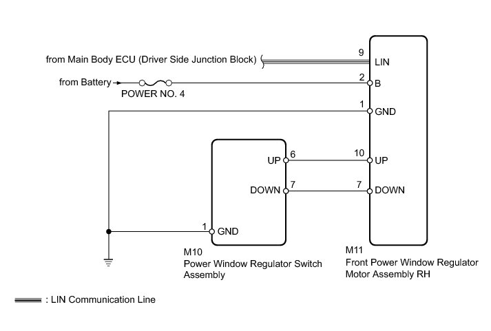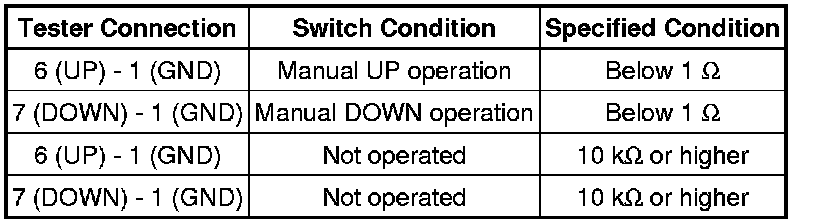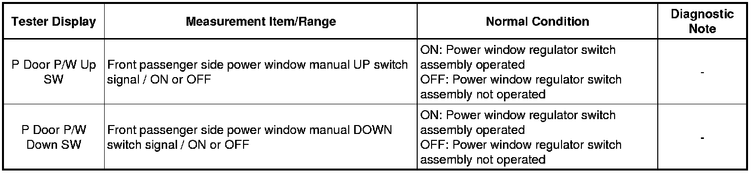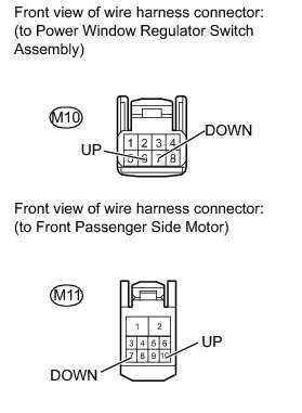 * If the manual UP/DOWN function does not operate, there may be a malfunction in the power window regulator switch assembly, the front passenger side motor, or the harness or connector.