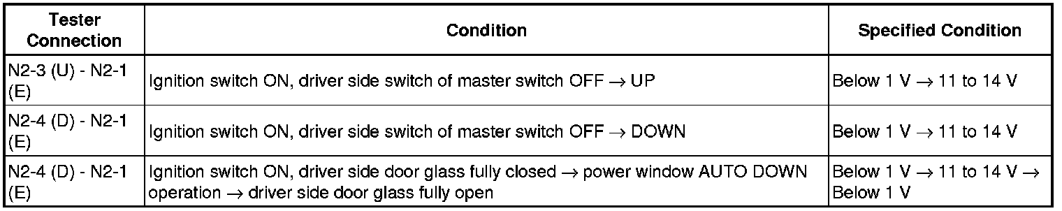 * If the driver side manual UP/DOWN function does not operate, there may be a malfunction in master switch, driver side motor or harness and connector.